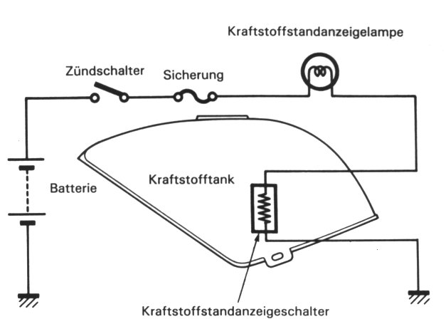 DerTrick liegt im Verhalten des NTC-Widerstandes (NTC=Negativer Temperatur Coeffizient) UND im ohmschen Verhalten einer Glühbirne. Der NTC und die Glühbirne werden in Serie geschalten. Solange der NTC vom Treibstoff umspühlt wird ist er gekühlt und leitet nicht. Sinkt der Treibstoffstand wird der NTC nicht mehr gekühlt und beginnt sich zu erwärmen und zu leiten....so weit so gut!