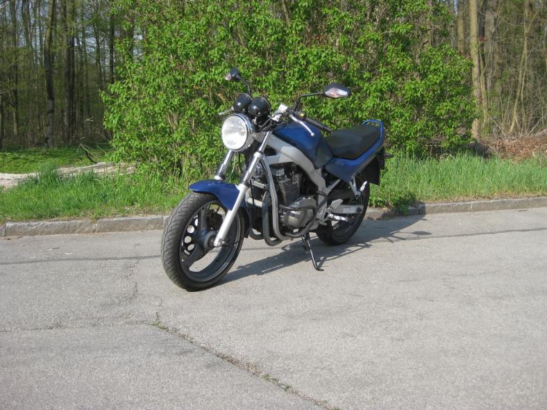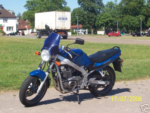 Bis jetzt ist es ja noch keine richtige Umbaustory aber mal sehen was daraus wird Zu den Bilder: 1&2 - So habe ich sie 2006 übernommen 3&4 - So sah sie nach drei 1/2 Jahren und einem Sturz aus. Linke Seitenverkleidung neu, unlackiert, hinten Miniblinker, vorne Spiegelblinker, LSL-Alufussrasten 5 - um mit ausreichend Hebelwirkung an die Schraube der Bremsleitung zu kommen musste ich den Luftfilterkasten ausbauen 6 - neue Stahlflexleitung hinten 7 - ... und vorne 8 - Krümmer mit stahlbürste entrostet und lackiert 9 - die Aufkleber habe ich mangels Fön (3mm-1a-Helmfrisur 10 - "Lackierkammer" aus Holzlatten und Baufolie. Hat Regen Sturm und Vulkanasche ausgehalten 11&12 - Lack ist drauf und muss noch richtig durchtrocknen 13 - Staubmaske benutzt/unbenutzt 14&15 - Den Tank muss ich zwar noch nacharbeiten weil ich leider keine Zeit mehr hatte die Grundierung richtig glatt zu schleifen (erste lackierung durch Benzin versaut weil der Lack noch nicht richtig durchgetrocknet war) aber sie ist wenigstens schonmal einfarbig, Rost- und Beulenfrei. Weiter geplant habe ich in dieser Reihenfolge: - Heckunterverkleidung von Balu-racing (liegt schon hier) - Schutzbügel & Kleinteile lackieren, Flugrost beseitigen - progressive Gabelfedern - Streetbar Lenker mit anderen Griffen/Lenkerenden - Doppelscheinwerfer edit, fast vergessen: - kleinere, flachere Instrumente - Zubehörfederbein - entdrosseln - Edelstahl Auspuffanlage wann es weitergeht hängt aber entscheidend von meinen Finanzen in den nächsten Monaten ab (So, ich hoffe der Text war jetzt nicht zu lang)