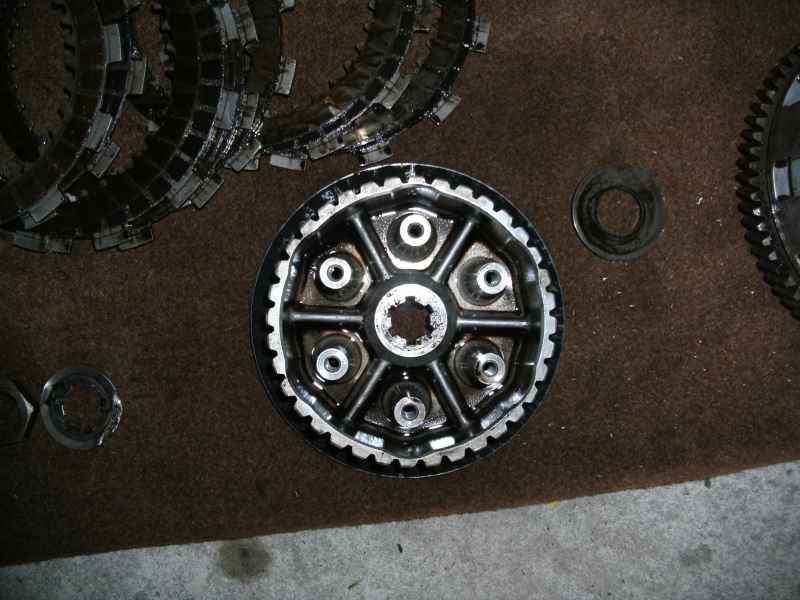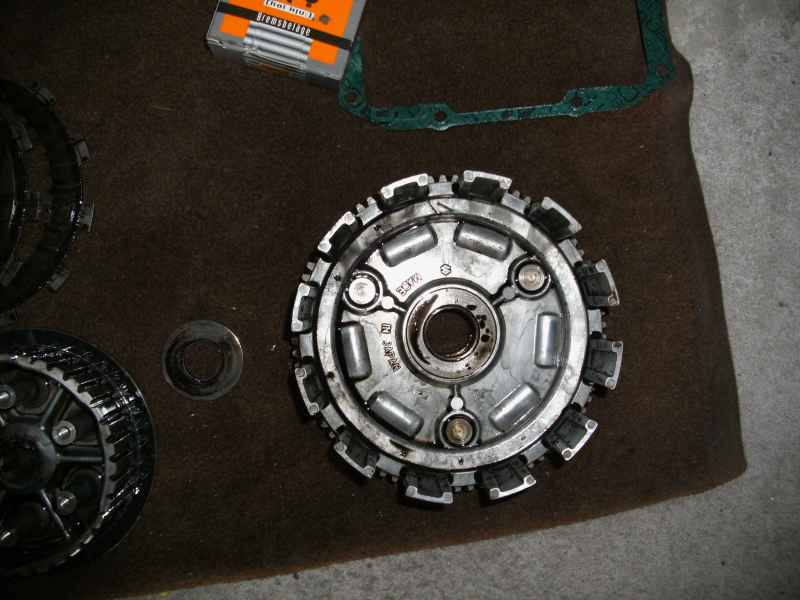 Tritt im Leerlauf bei Standgas ein "Klappern" oder "Scheppern" auf, welches beim Ziehen der Kupplung und/oder Gangeinlegen weg ist, sind die Kupplungskorbtorsionsfedern ermüdet. Dieses Problem tritt bei fast allen Motorradkupplungen mit der Zeit auf (Ausser bei Ducati - da ist das ein "Feature" das von Anfang an dabei ist....). Abhilfe: Diese Federn sitzen tangetial in der Hinterseite des Kupplungskorbes. Sie zu tauschen ist nicht einfach, da das Material des Kupplungskorbes/Zahnrades extrem hart ist und man die Bördelung nicht aufbekommt. Einfacher ist es eine Beilagscheibe einzusetzen. Dieser muss aber an 2 gegenüberliegenden Stellen eine Flachstelle aufgeschliffen werden - sonst bekommt man sie nicht rein (Achtung: Die Federn sind extrem stark/hart!). Sollte das nichts mehr nützen bleibt nur mehr der Tausch des ganzen Korbes. Dieser Fehler ist zwar nur ein "Schönheitsfehler", der die Funktion nicht beeinträchtigt, aber er nervt vom Geräusch her..... Einer der Hauptgründe (neben hoher Kilometerleistung) für diese Abnutzung ist das Fahren mit ungleichmäßig gelängter Kette...... |