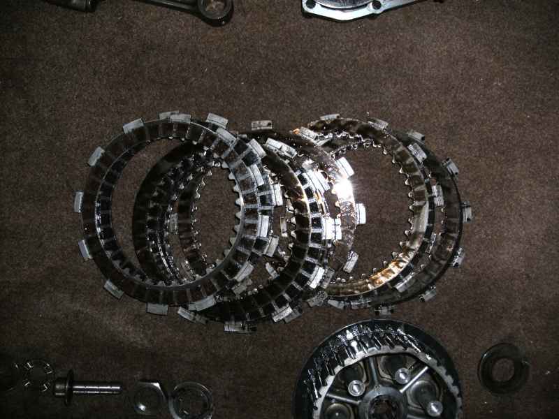 Wie immer: Alle Angaben ohne Gewähr. Eine Ölbadkupplung ist relativ verschleißarm. Meistens hält sie weit über 50000 km. Sollten die Beläge doch mal abgenutzt sein, die Kupplung trotz korrekt eingestellten Leerwegs rutschen, muss man nachsehen was los ist, also die Kupplung ausbauen. Dazu muss der rechte Motorgehäusedeckel entfernt werden. Vorbereitung: Zuerst sorgt man für einen ordentlichen Arbeitsplatz. Licht ist ein Muss. Ich arbeite ungern im Dunkeln. Der Boden sollte nicht sandig sein. Wenn der Beton in der Garage mürbe ist, so wie bei mir, schadet es nicht einen großen Karton, ein großes Stück alten Fußbodenbelag oder ähnliches unter zu legen. Schafft sich einfach angenehmer, wenn was runter fällt, ist auch nicht gleich alles voller Dreck. Das Werkzeug sollte griffbereit sein. Wer Ordnung hält ist zwar nur zu faul zum Suchen, braucht aber weniger Zeit. Ein oder zwei Schachteln für Kleinteile sind auch nicht verkehrt. Da geht nichts verloren. Jetzt geht’s los: Zunächst Das Motoröl ablassen, es würde ohnehin auslaufen. Möglicherweise geht es auch, wenn man das Motorrad auf die linke Seite legt, ohne Ablassen des Öls. Aber das auf eigene Gefahr. Danach muss man den Zündgeber von der Kurbelwelle entfernen. Dazu den kleinen Deckel mit den drei Schrauben entfernen. Den Zündgeberrotor entfernt man in dem man die große Kontermutter mit einem Ringschlüssel (SW 19 mm) hält und die Befestigungsschraube entfernt. Danach kann man den Rotor abziehen. Hierbei sollte man sich die Lage des Stiftes am Ende der Kurbelwelle merken (notieren, fotografieren nur nicht vergessen), der in den Schlitz des Rotors greift. Der passt nur in einer Position. Der Rest kann im Motordeckel eingebaut bleiben. Man muss nur alle Kabelverbindungen hinter dem linken Seitendeckel und Kabelbefestigungen lösen, ist ja logisch, sonst kann man den Deckel nicht abnehmen. Da hilft nur gucken, nachdenken und handeln. Wenn man alles gelöst hat, kann man die Gehäuseschrauben kreuzweise und in Stufen lösen. Das soll verhindern, dass sich der Deckel verzieht. Sinnvoller Weise merkt man sich die Lage der Kabelklemmen (Fotos machen, notieren, skizzieren), das erleichtert später den Zusammenbau. Achtung: Wer sie nicht gesehen hat, vergisst die beiden Schrauben im Kupplungsdeckel unter dem Zündimpulsgeber. Die müssen natürlich auch entfernt werden. Wenn man es noch nicht getan hat, sollte man spätestens jetzt eine saugende Unterlage unters Motorrad legen, es könnte Öl auslaufen wenn man den Gehäusedeckel abhebt. Sollte der fest sitzen, nicht mit einem Schraubendreher oder Montiereisen hebeln. Dabei kann man den Deckel beschädigen. Besser mit einem Plastikhammer oder Hauthammer (der hat einen weichen Hammerkopf, ein Gummihammer tut es zur Not auch, ist aber größer und schlechter zu handhaben), ringsum mit leichten Schlägen gegen den Deckel klopfen, der löst sich dann besser. Dabei aufpassen, dass man keine Schrammen in den Lack macht. Aber erst nachsehen ob auch alle Schrauben entfernt wurden. Wenn man den Deckel schon ab hat, kann man auch gleich die Dichtung bzw. ihre Reste entfernen. Aufpassen, dass die beiden Passhülsen nicht verloren gehen. Dafür haben wir ja unsere Kleinteileschachtel in der sich bereits der Zündgeberdeckel mit seinen Schrauben, die Gehäuseschrauben, die Kabelklemmen, der Zündgeberrotor und die Befestigungsschraube befinden sollten. Nachdem die Dichtungsreste entfernt sind, kann man den Gehäusedeckel zur Seite legen. Am Besten mit der Dichtfläche nach unten auf einen Karton oder ein paar Lagen Zeitungspapier, Lappen tun es auch. Halt so, dass nichts passieren kann und dass keiner drauftritt, drüberfällt. Nun sollten wir auf die Kupplung blicken können. Anmerkung: Die Zahlen in Klammern bezeichnen die Bauteile wie sie in der Zeichnung abgebildet sind. Als nächstes werden die Druckplattenschrauben (1) der Kupplungsdruckplatte (4) Schritt für Schritt und über Kreuz gelöst. Das macht man so lange, bis die Kupplungsfedern (3), die sich um die Schrauben befinden, entlastet sind. Wenn sich die Kupplung beim Schrauben mitdreht, kann man die, sofern der Motor noch im Rahmen eingebaut ist, mit eingelegtem Gang mit der Hinterradbremse festhalten. Dazu braucht man einen 2. Mann/Frau oder eine Hilfskonstruktion. Es gibt auch spezielle Gegenhalter. Man kann auch einen Lappen zwischen die Zahnräder des Primärantriebs stecken, das blockiert das Ganze auch. Manchmal liest man auch, dass man einen Schraubendreher in die Zahnräder stecken kann. Dabei könnten aber die Zähne der Zahnräder beschädigt werden. Hat man alle Schrauben (1) gelöst, kann man diese, die Hülsen (2) und die Federn (3) herausziehen. Ich würde jetzt eine 2. Schachtel damit befüllen, damit es später keine Verwechslungen gibt. Nun kann man die Druckplatte (4) herausziehen. Danach kann man die Druckscheibe (5), das Ausrücklager (6) und den Druckpilz (7) entnehmen. Der Druckpilz hängt entweder an der Druckscheibe (6) oder in der Eingangswelle. Man kann jetzt auch die rechte Hälfte der Kupplungsdruckstange (19) herausziehen, dazu müsste man die Druckstange von links durchschieben oder den Motor nach rechts kippen. Muss man aber nicht unbedingt herausnehmen. Alles wieder in die 2. Schachtel legen. Jetzt greift man sich das ganze Paket Kupplungsscheiben (8 und 9) und nimmt die als Ganzes aus dem Kupplungskorb. Wenn man die Scheiben nicht wechseln will/muss, müssen die so auch wieder eingebaut werden, man darf die Reihenfolge und die Einbaulage also nicht verändern. Das sollte man beim Inspizieren bedenken. Wenn man das Paket trennt - muss man zwangsläufig, wenn man die Belagstärke und den Verzug messen will - dann so, dass man es später wieder richtig zusammensetzen kann. Am Besten irgendwie markieren (Vorschlag: eine Stelle quer über alle Scheiben entfetten und einen Strich mit einem Edding drüberziehen, die Markierung am Kupplungskorb nicht vergessen). Wenn die Scheiben verschlissen oder