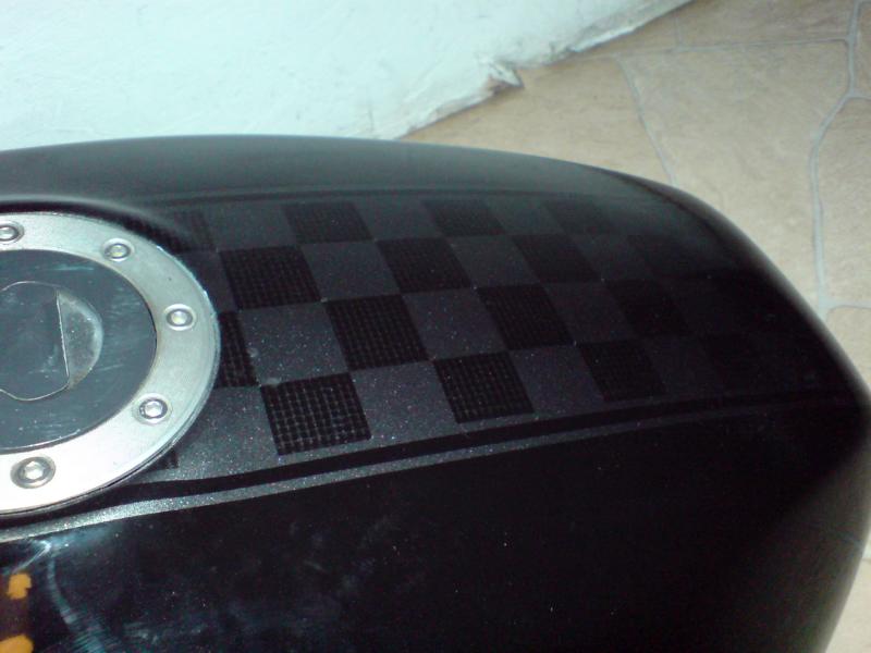 Hier mal für euch Detailaufnahmen von der (für meinen Geschmack) recht gelungenen Tanklackierung (war beim Kauf schon so) und vom reparierten und gelackten Bugspoiler. Die Karos vom Tank finden sich übrigens auch auf dem Frontfender wieder.
