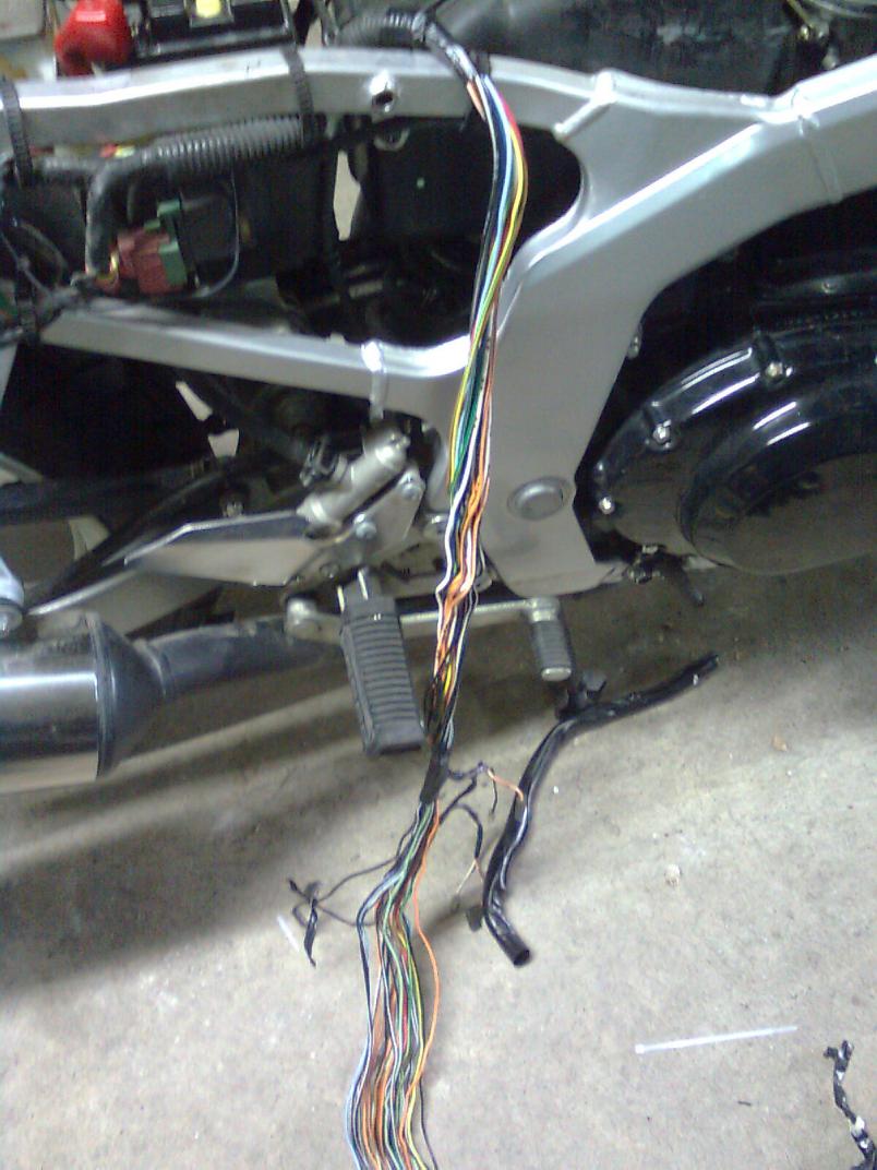 Wie man erkennen kann, war dadurch plötzlich ein riesiger Haufen Kabelsalat vorhanden, der unter und über dem Scheinwerfer hervorquoll. Also beschloss ich mein erstes Projekt: Der Kabelbaum ist fällig. Gut, erstmal die FAQ gelesen und 2 Varianten entdeckt. Leicht (=Kabelbaum unterm Tank kreuz & quer reinwurschteln) oder anspruchsvoll (=Kabelbaum kürzen).