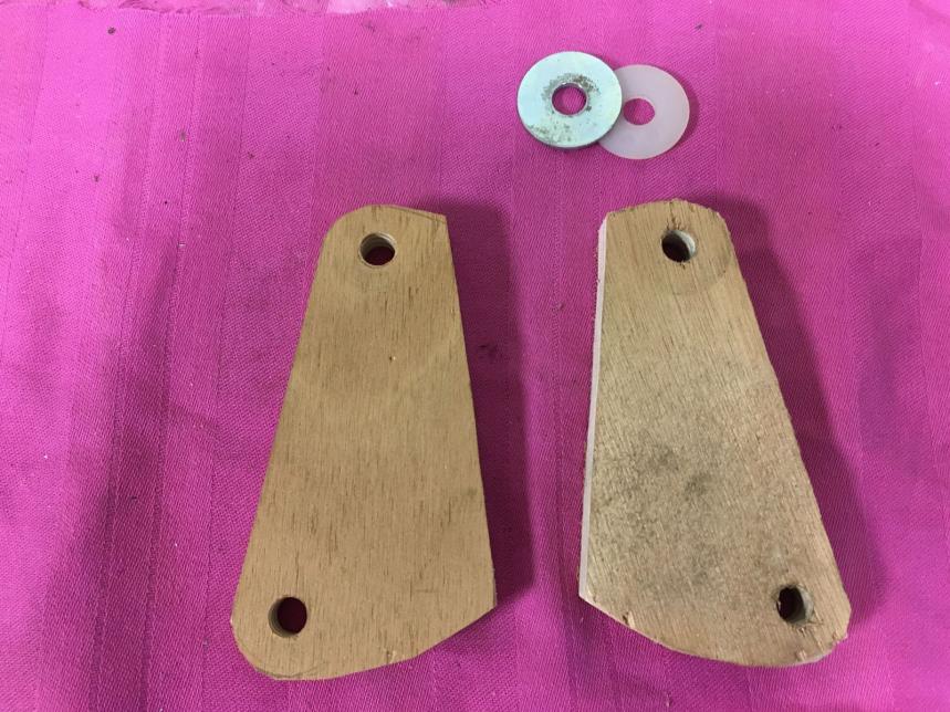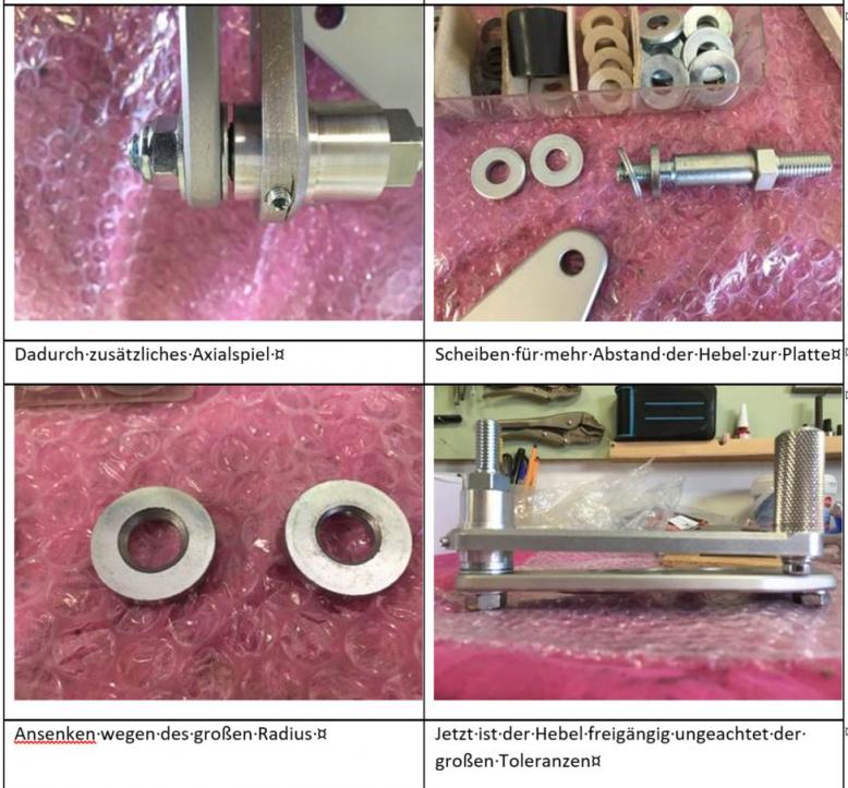 die Hebel waren vormontiert, ich hab die nur auf die Achse geschoben. Die Hebelarme sind falsch herum auf die Hülse gepresst. Man könnte das jetzt retten, indem man die Fußhebel und Gelenkköpfre jeweils auf die andere Seite der Arme montiert, dann käme der lange Überstand der Hülse zur Platte. Aber die Arme sind außen angefast und gestempelt und innen glatt. Sähe also aus.