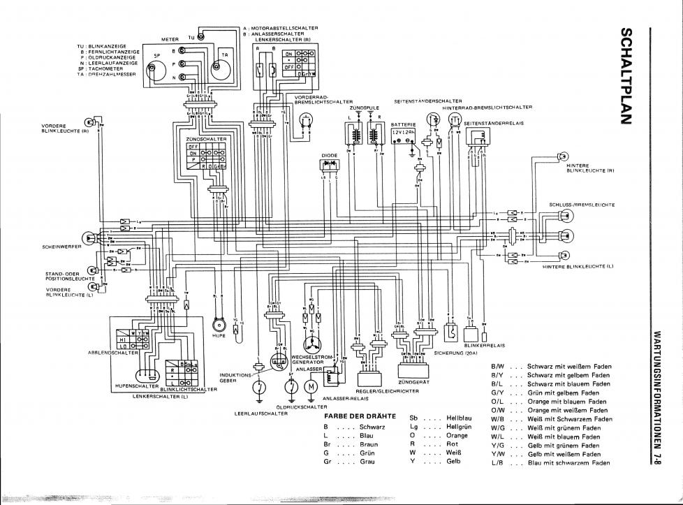 Ja das Starterrelais schaltet auf Masse durch; der Starterknopf bekommt orange-weiß rein und führt gelb-grün raus, was dann einmal einen Umweg über den Lampentopf nimmt und dort original einen Rundstecker (Japanstecker) hat. Laut Schaltplan geht das gelb-grüne Kabel dann ins Starterrelais rein und kommt schwarz-weiß (Masse) wieder raus.