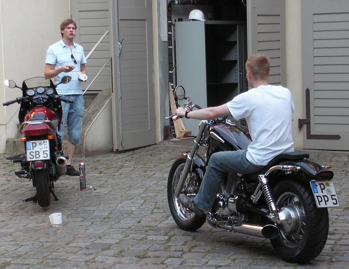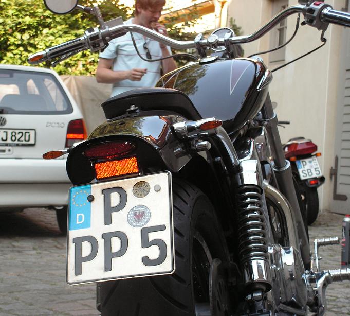 Hab lange nichts machen können, weil ich neben allerlei Prüfungen mit dem Umbau einer Suzuki VS1400 Intruder beschäftigt war: Anhang 9067 So original war sie dem Besitzer kaum zuzutrauen...ein wahnsinnig schmaler mini-Apehanger und Rasten, die vielleicht für nen 12-jährigen bequem vorverlegt erscheinen :roll: Auch die Sitze erinnerten eher an Clubsessel als an Motorradgestühl... Also hamwa eine vorverlegte Fußrastenanlage von Falcon, einen LSL Flybarlenker mit entsprechend neuen Stahflexleitungen für Bremse und Kupplung, einen GTS HardriderSitz und rundrum Kellermänner verbaut. Das olle aufgesetzte Suzukirücklicht wurde durch ein kleines ovales LED-Rücklicht unterm Fender ersetzt, wodurch das Kennzeichen gut 6cm höher konnte um die Sicht auf die neue, schick geschnittene und weniger ballonige Pelle freizumachen. Anhang 9062Anhang 9063Anhang 9064 Ich würde hinten noch kürzere Federbeine und auf jeden Fall nen andren Auspuff verbauen (die 1400er Trude hat beim Soundcontest gegen meine GS so wahnsinnig abgestunken, dass der Besitzer ganz traurig wurde :cry: 8) ). Naja...jedem seins. Meine Bananenschwinge war derweil beim Fräser um pro Seite 4mm wegzufräsen. Der Fräser sagt: wahnsinnig hartes Alu! Er hat auch fast 2 Stunden dran gesessen (neben dem harten Material ließ sich die Schwinge auch schlech spannen, wegen den ganzen Nähten und Buckeln). Wenn das keiner von Vadderns Fußballkumpelz gewesen wär, wär`s echt teuer geworden...so war`s n Zehner in die Kaffeekasse :D Anhang 9065Anhang 9066 Wie man sieht, brauche ich noch die passende Umlenkung (so liegen die Knochen an der Schwinge an und die Schwinge steht doch arg hoch). Bis ich die bekomme, kanns leider ein Weilchen dauern :( so far... |