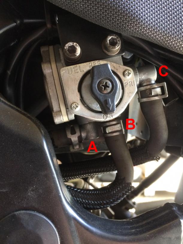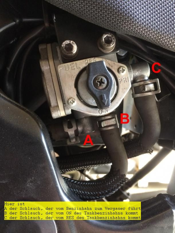 Der Tankbenzinhahn ist beim neuen Modell der gleiche wie beim alten Modell, dort hat sich die Belegung/Anordnung nicht geändert. Der lange Nippel ist nach wie vor Reserve/PRI, der kurze Nippel ist nach wie vor ON. Der andere Benzinhahn sieht beim neuen Modell (ab K4 zumindest) wie folgt aus: http://forum.gs-500.de/attachment.ph...chmentid=24560 Hier ist A der Schlauch, der vom Benzinhahn zum Vergaser führt B der Schlauch, der vom ON des Tankbenzinhahns kommt C der Schlauch, der vom RES des Tankbenzinhahns kommt |