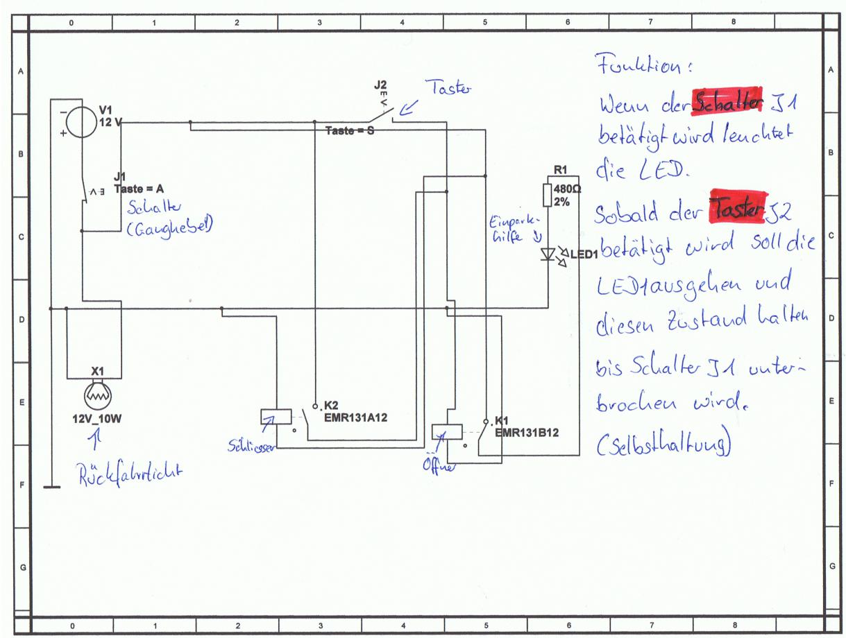 Die Funktion dieser Schaltung soll so sein: Der Schalter vom Rückwärtsgang wird geschlossen. Damit leuchtet das Rückfahrlicht. Nun möchte ich aber das damit automatisch die Einparkhilfe aktiviert wird. Das ist ja ganz einfach den wenn ich es hinter den Schalter für das Rückfahrlich anschließe ist es ja eingeschaltet. So weit so gut. Nun brauche ich aber die Einparkhilfe nicht immer. Das heißt ich möchte mit einem Taster im Cockpit die Einparkhilfe deaktivieren. Es muss ein Taster sein weil da gibt es im Cockpit schon einen. Durch betätigen des Tasters soll das Relais K1 anziehen und mit dem Öffner die Einparkhilfe deaktivieren. Auch nicht so schwer. Nun ist es aber so, dass das Relais K1 nur so lange angezogen ist wie der Taster (hier J2) gedrückt wird. Also muss eine Selbsthaltung hin. Diese will ich über K2 machen. Das bedeutet wenn ich den Taster drücke soll K1 über den Öffner die Spannungsversorgung zur Einparkhilfe unterbrechen. K2 soll gleichzeitig anziehen und als Schließer den J2 überbrücken und quasi simulieren das der Taster J2 gedrückt wird. Wenn ich dann den Rückwärtsgang rausmachen fallen ja alle Relais ab und das Spiel kann von vorne beginnen. |