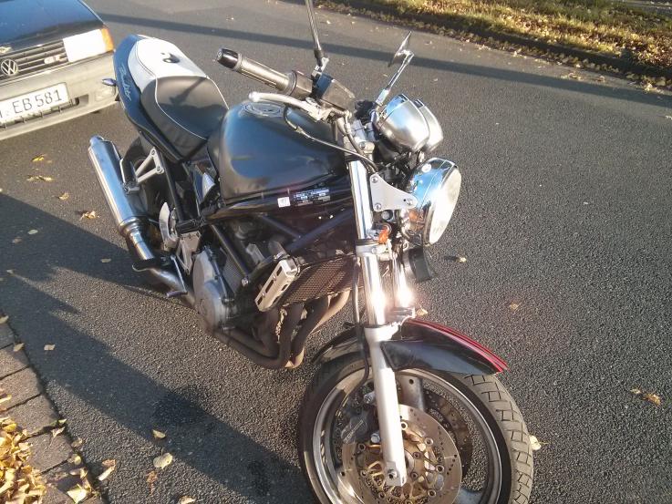Leider das letzte Bild von meinem Motorrad in fahrbahrem Zustand. Heute wurde mir die Vorfahrt genommen und ich wurde schön von einer Dose abgeräumt. Mir ist dabei so gut wie nichts passiert aber der Rahmen ist verbogen und überall ist etwas kaputt. Grüße |