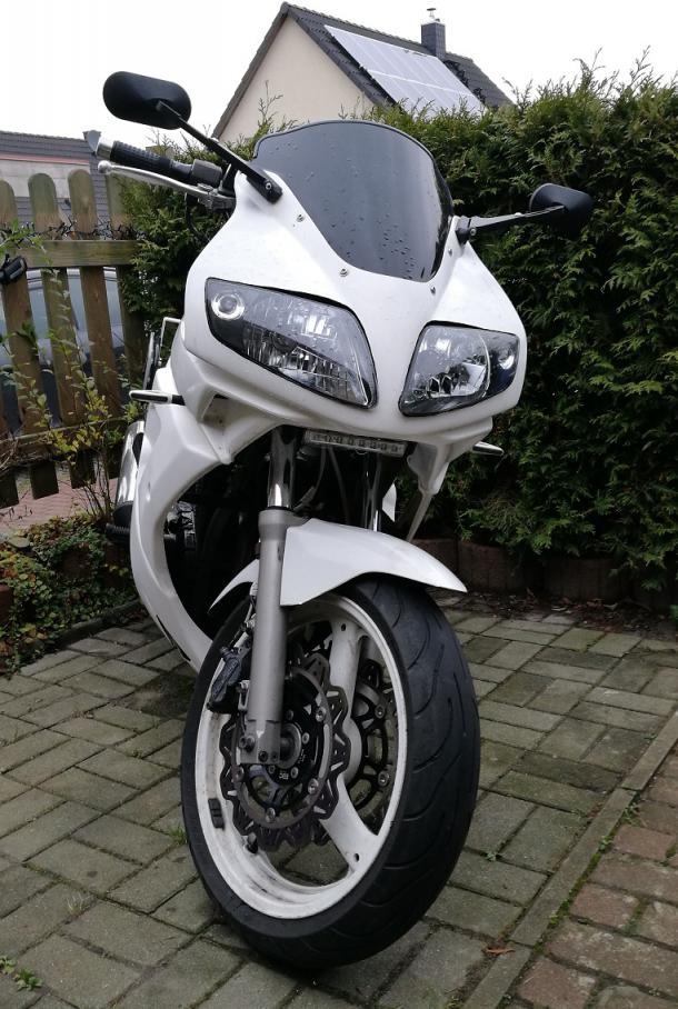 GM51B, EZ 1993, über 100.000km (oder auch 100Mm), gekauft 2003 mit ca. 24.000km (24Mm) Änderungen/Anbauten/Umbauten: - Vollverkleidung Nr148 (Racingverkleidung ohne Halter, ohne Licht) - Scheinwerfer SV650S bzw. SV1000S - Verkleidungsspiegel SHINYO - Scheibe Bodystyle "Racingscheibe" - Tacho: KOSO RX1N+ - Stebel Nautilus Compact - Scottoiler - Gabel und Bremse vorn Bandit400 - Bremsscheiben vorn EBC Wave - LSL Superbikelenker - gedrehte Edelstahl-Lenkerenden - Federbein von YSS - Umlenkhebel Bandit 600 (B6Pop) - vorne PiPo 2ct 110/70R17 auf 3"-Felge - hinten PiPo 2ct 150/60R17 auf 4,5"-Felge - Edelstahlauspuffanlage bis auf den originalen Endtopf - Stahlflex vorn (Melvin) in weiß - Tank neues Modell - Sitzbankbezug handmade - LED-Rücklicht originale Form in schwarz - LED-Blinker (mit Relais-Wechsel) - Kofferträger KwING (Krauser) - Tankring Quicklock Evo |
