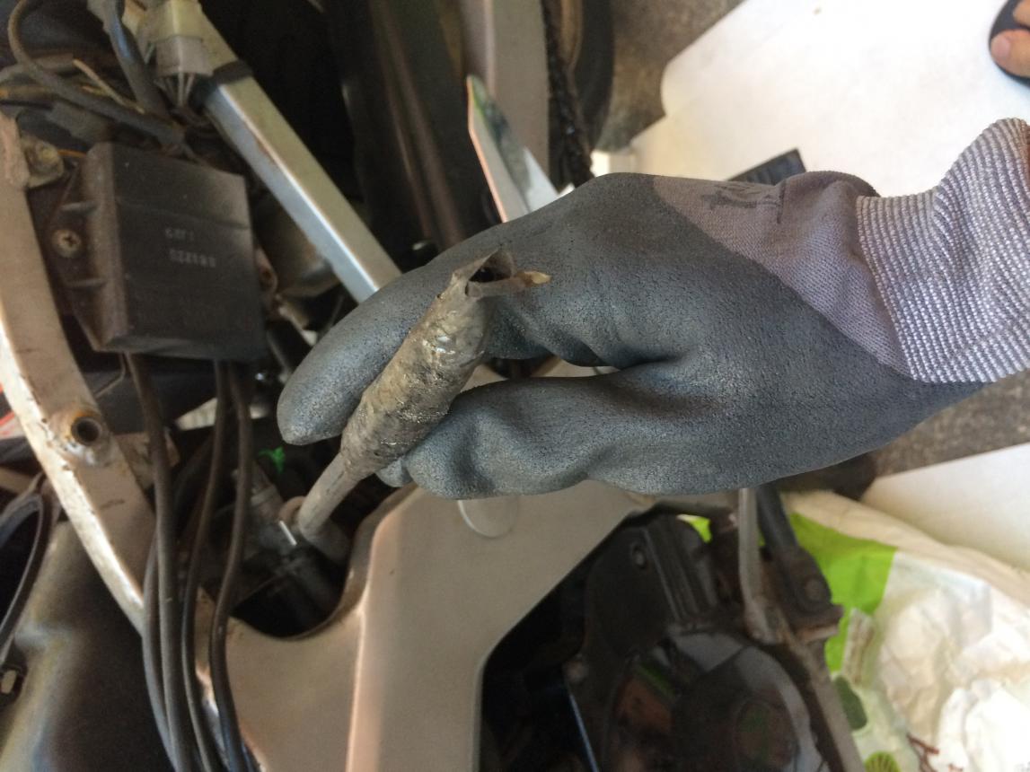 Weiter gehts. Ölpegel weit über dem normalen Füllstand, Öl riecht nach Benzin. Das schon mal nicht gut. Das erste Mal den Ablauf vom Luftfilterkasten in der Hand. Was sich der Vorbesitzer dabei gedacht hat...keine Ahnung. Erster Blick auf den Vergaser und Gas-Bowdenzug.