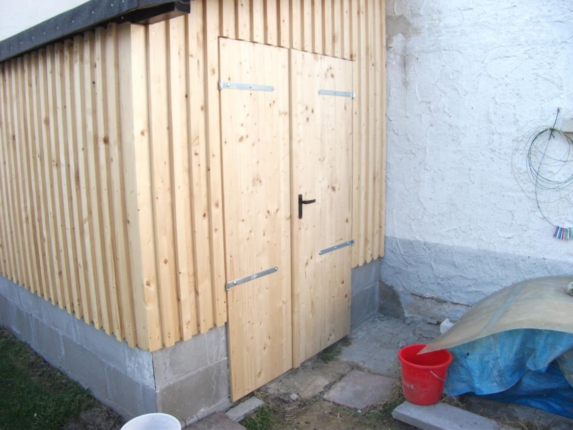 Um meine Garage etwas zu entleeren, habe ich mal eine "Remise" angelegt. An dem Platz war vor langer Zeit ein Hühnerstall. Deswegen auch die Abmessungen von 2,1 x 3,2 m. In der Mitte ist noch Platz für die Himalayan. Es ist noch nicht ganz fertig. Es fehlt noch die 2. Lage Dacheindeckung (Bitumenschindeln), die Regenrinne und die Ortgangbleche. Falls sich jemand über fehlende Diagonalstreben an den Ecken mokiert, das ist durch die Beplankung (23 mm starke Schalbretter) so verwindungssteif, dass es die nicht braucht. Die Langzeitbeobachtung hat auch erbracht, dass die Feuchtigkeit (Spritzwasser) nie über die erste Lage Schalungssteine geht. Das wird sich mit der Regenrinne und einer Beschichtung des Sockels noch verbessern.