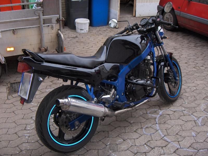 Was wurde an "Mathilda" verändert? -Rahmen und diverse Teile Pulverbeschichtet - blau-metallic, schwarz -Tank, Plastikteile, etc. in Saphirschwarz lackiert - schwarz-metallic mit blauen Flakes -LED Blinker -Felgenrandaufkleber -Remus-Phoenix Auspuffanlage -Sturzbügel LG Mikey |
