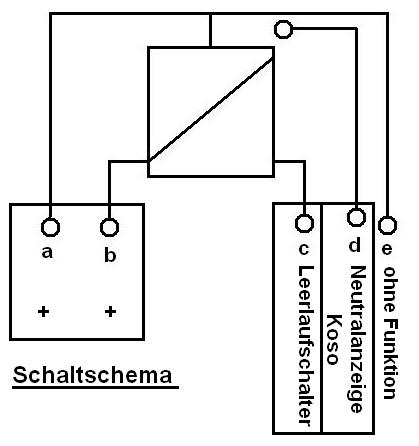 zu2 also das relai von meinem Link hat 5 anschlüsse, 4 brauchste. aber auf dem relai müsste ne kleine skizze sein die ähnlich is wie meine da kannste dann rauslesen was de brauchst du brauchst die 2 anschlüsse von der spule und nen schließer, der eine kontakt vom öffner bleibt frei zu3 ne der leerlaufschalter bekommt sein plus in der instrumentenanzeige von Orange und wird dann über die masse geschalten zu4 ja orange ist plus, da hab ich mein plus her für den schließer vom relai zu5 naja da sind nur 5 kabelschuhe die rausschauen aber an den kontakten sind kleine nummern, wie gesagt du hast auf dem relai n kleines schaltbild in etwa wie meins bloß das hat die nummern anders sind mfg