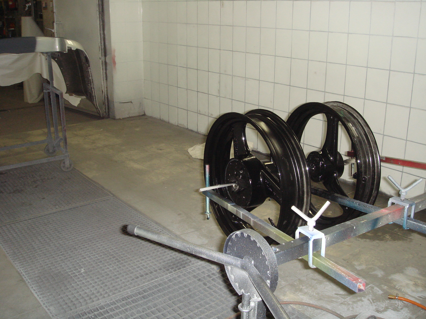 die felgen sind mittlerweile lackiert in der farbe schwarz. (farbcode PXR con Chrysler, welches schön silbern schimmert) der rahmen und die anderen teile sind gefüllert, geschluffen und abgedeckt und am montag wird das mopped in die lackierbox geschoben (steht grad auf nem rollbrett ) hier werd ich wieder ne chrysler farbe nämlich PS2 nehmen das ist ein sehr schönes silbernatürlich halt ich euch am laufenden
