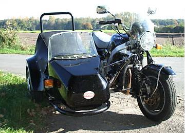 der Gespannumbau wurde von der Firma Sauer gemacht. Der Beiwagen ist ein Sauer Falke. Das Fahrwek erhielt eine Schwinge mit Bilstein Federbeinen und Smart 15 Zoll Räder. Das hintere Federbein wurde original gelassen, und durch eine stärkere Feder angepasst. Den Umbau habe ich bei eBay gebraucht gekauft. So kostete das komplette Motorrad etwa den Preis des neuen Beiwagens. |