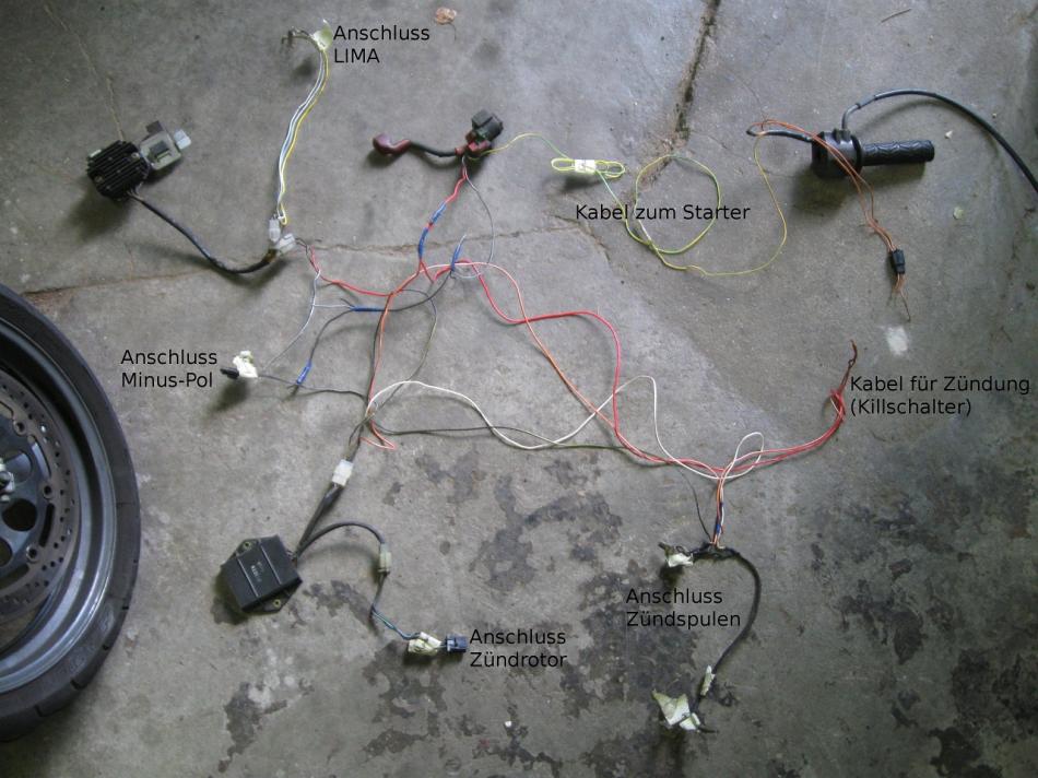 (Wenn ich das noch richtig in Erinnerung habe): Zündung an: wenn die beiden "Kabel für Zündung" verbunden sind. Anlasser dreht, wenn man das "Kabel zum Starter" dazuschaltet. Werde das ganze so machen, dass ichs über die orginale Armatur schalten kann. Bild einmal klein im Anhang bzw. da: http://picasaweb.google.de/lh/photo/...eat=directlink in Großer auflösung und zum Vergleich nochmal der (für mich) unnötige "Müll". ps: ich schließe jede Garantie aus!