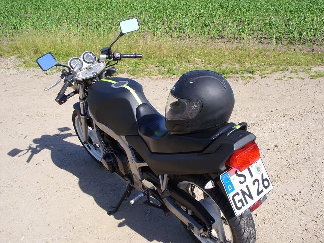 Kosten: - stahlflex glaube ich 80€ - progressive gabelfedern glaube ich 80€ - Scheinwerfer 80€ - Spiegel + Blinker ca. 40€ - Lack kann ich nicht sagen, ist LKW lack, wurde mit geschenkt - Auspuff liegt glaube ich bei 190€ (habe mir eine 2. maschine gekauft , da war er dran) - Diverse flüssigkeiten geschätzt 40€ Reifen + Verschleißteile zähle ich nun eben so wie die Stunden nicht auf |