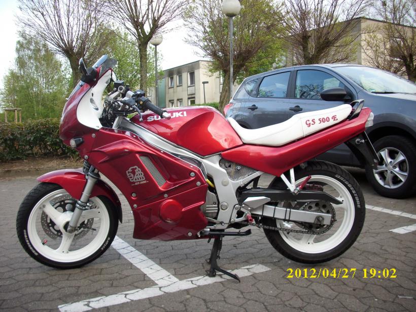 Was hab ich denn schönes: Meine Lady: BJ 1997 5Star Vollverkleidung KM-Stand: knapp 51.000km Die Umbauten: -Felgen erneuert und neu veredelt in weis -progressiv Federgabel -Stahlflexleitung vorn -zusatz LED-Beleuchtung in Frontscheibe und Bugspioler, Abschaltbar vom Cockpit aus -Verkleidungspiegel mit extra weiten Distanzstücken -Verkleidungsblinker LED -Zweiklang Horn -Warnblinkanlage schaltbar vom Cockpit -Verkleidung verbreitert und verschlossen zwischen Rahmen und Chasi -neuer Luftfilter -Tachobecher demontiert und Acewell 3250 und C37 Kontrolleinheit ins vordere Chasi eingearbeitet -zweite Sitzbank in weis mit rotem Schriftzug -LED-Rücklicht von GS500F -LED-Blinker hinten -Grillgitter in Verkleidungslücken eingearbeitet -LSL-Fussrasten hinten -H-Q Rasten vorn -Jetzt das aufwendingste: Kabelbaum komplett erneuert und in mehrere Sicherungskreise aufgeteilt und verbessert -Zündschloss erneuert -Notstartsteckdose -Griffheizung -Scottoiler unter der Verkleidung montiert -für Funksystem und Komunikation PTT-Taste installiert Für dei Wahl bitte das dritte und siebente Foto nehmen. Danke