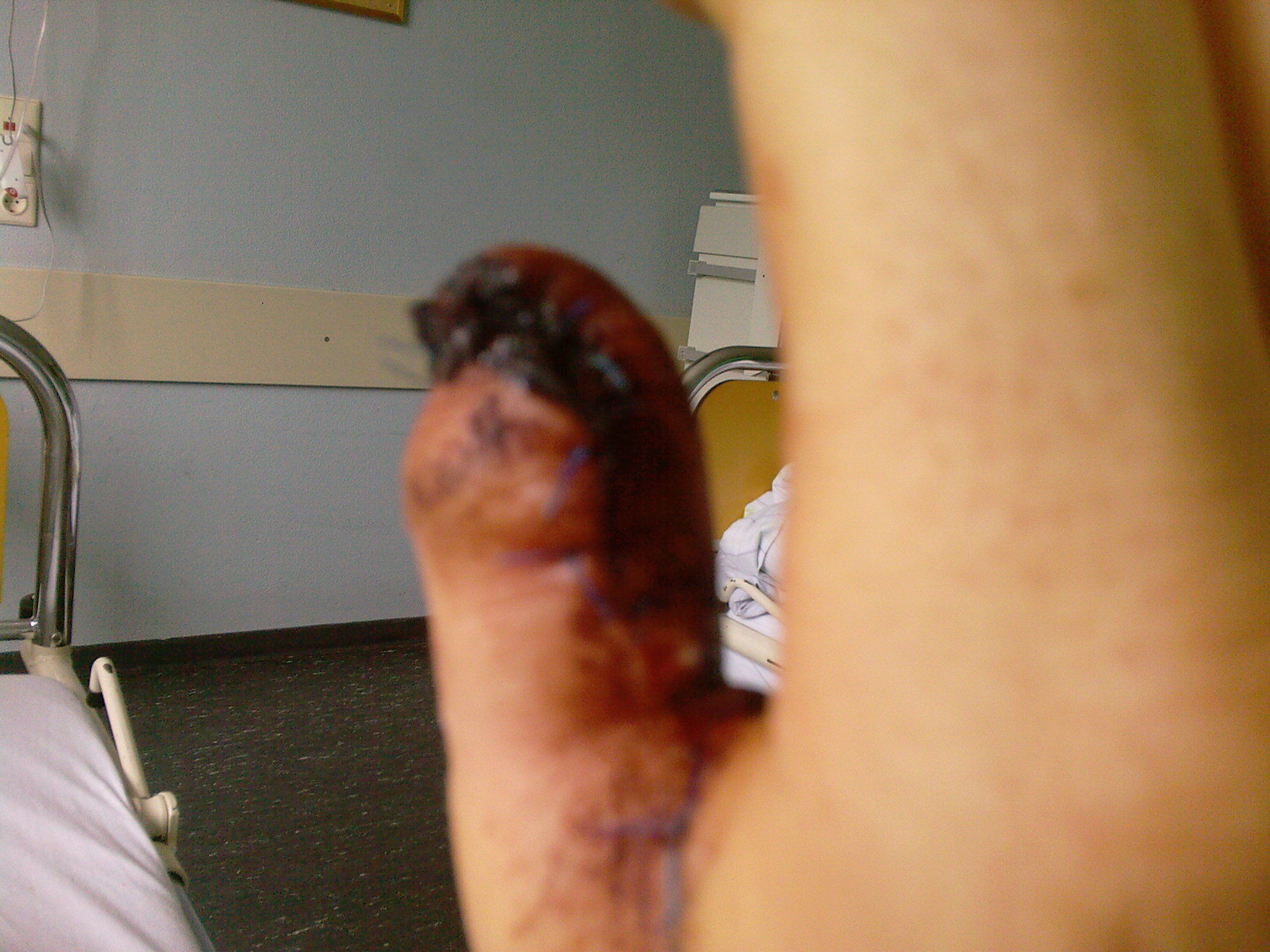 Im K wurde der Daumen noch am selben Abend operiert(70 min) und ich musste 5 Tage im KH bleiben. Jetzt sieht der Daumen so aus, es fehlt alles das, was länger als Damennagel war. Die Haut des Daumens wurde hochgezogen(links und rechts nen Schnitt) und vorne drangenäht.