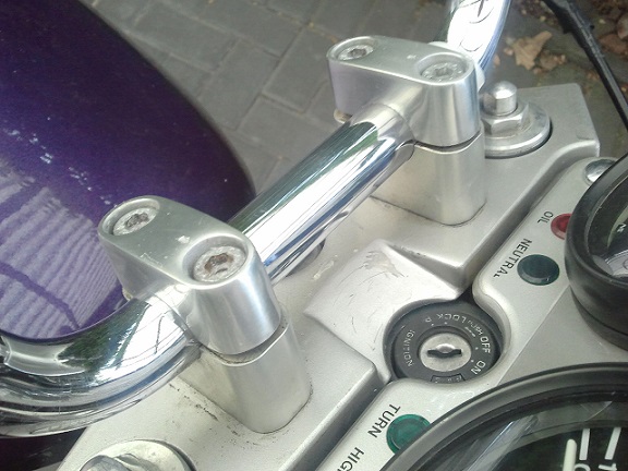 Die Brücke ist auch nicht für den Rohrlenker gedacht, sondern original mit Lenkerstummeln ausgestattet (daher die 2x2 Gewinde schräg in Fahrtrichtung...da scheint Klebeband drübergeklebt zu sein). Wie bereits erwähnt müsste der Lenker irgendwo eine Kennzeichnung haben. Wenn du die Kennzeichnungen auf Klemmböcken und Lenker findest, können wir dir vielleicht helfen, den Hersteller zwecks Gutachtenbeschaffung ausfindig zu machen. Die Stahlflexbremsleitung muss auch eingetragen werden, sofern du keine ABE dazu hast (dann wäre irgendwo auf der Leitung (meist auf einem Stück Schrumpfschlauch) eine KBA-Nummer (heißt so, weil sie mit "KBA" anfängt)).