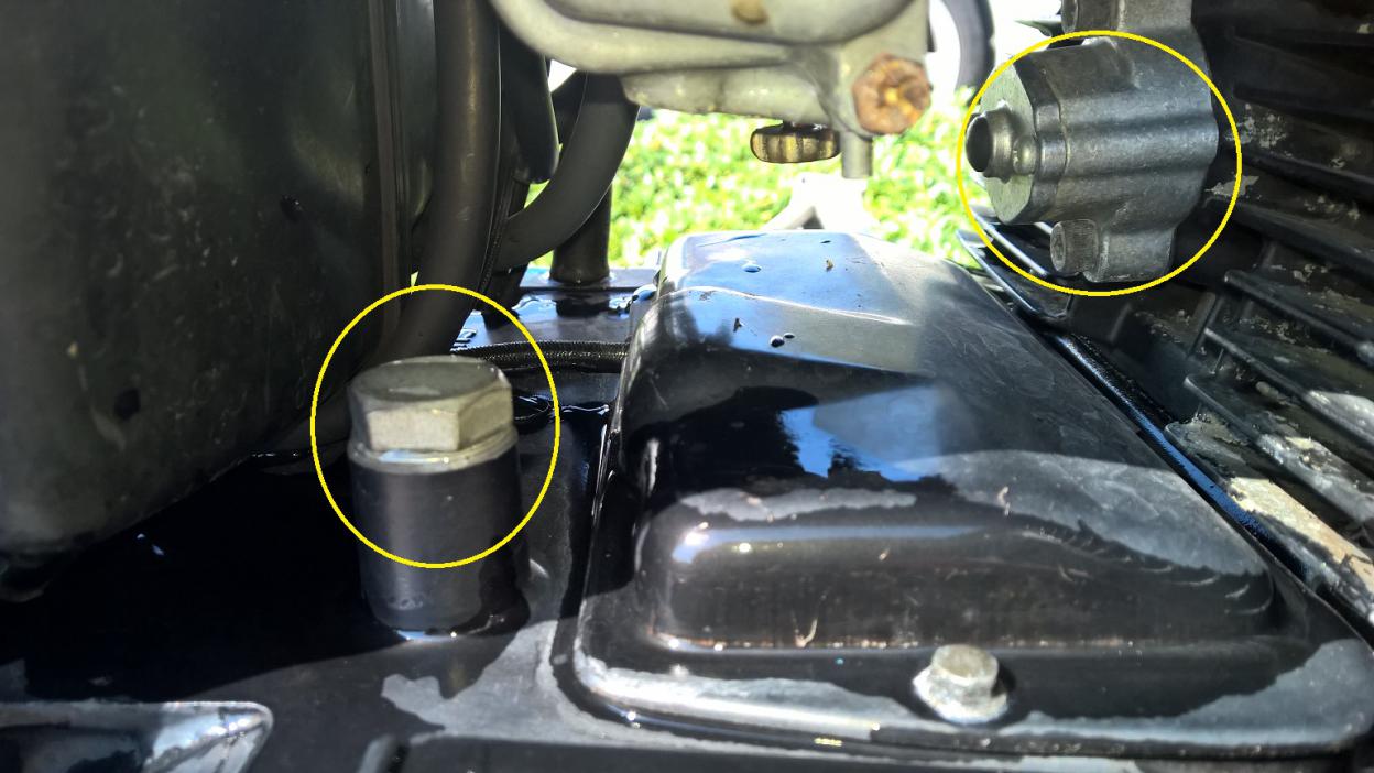 Die Schraube auf dem Getriebegehäuse hält federbelastet den Leerlaufarretierkolben. Soll bedeuten: Unter der Schraube ist eine Feder, die auf den Leerlaufarretierkolben drückt. Der Leerlaufarretierkolben rastet in die Sperrklinke der Schaltwelle ein. An beiden Teile, dem Steuerkettenspanner und dem Leerlaufarretierkolben, nicht unnötig herumschrauben.