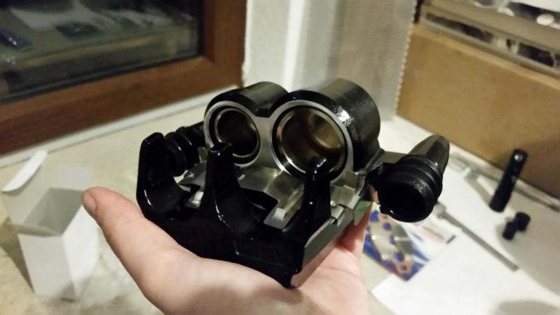 Mal kurz der Werdegang, was alles gemacht wurde und was mir aufgefallen ist: -die neue Spiegler PEAK Scheibe montiert, vorher Vorderrad komplett gereinigt, insbesondere die Auflagefläche für die Scheibe, aber auch sonst alles (Tachoantrieb etc.). Schrauben mit Loctite mittelfest eingesetzt und mit Drehmoment über Kreuz angezogen. -komplettes Rad mit neuer Scheibe neu ausgewuchtet (Reifen ist vor ca. 200km neu draufgekommen), von der Suzi Werkstatt kontrollwuchten lassen -> alles ok, außerdem dort gefragt, ob die Radlager noch ok seien -> ok -Vorderrad mit neuer, gefetteter Achse sowie neuer Hülse (die rechts im Gabelauge sitzt) und neuer selbstsichernder Mutter montiert... die alte Achse war krumm und so mit der Hülse verbacken, dass sie nur von rechts eingeschoben werden konnte... soll ja aber von links, was jetzt auch so ist. Später, als die Bremse wieder komplett war, wie von hier empfohlen, Mopped auf beide Räder gestellt und durchgefedert, dann wieder aufgebockt und Klemmschraube angezogen. Reifendruck von 2,3 auf 2,5 erhöht, da ich hier irgendwo gelesen habe, dass das etwas gegen den Sägezahn beim BT45 hilft. -Bremssattel ausgebaut (alte Bremsflüssigkeit abgesaugt), komplett zerlegt und alles gereinigt (etliche Stunden). -neuen Kolbensatz samt Isolatoren und allen 4 Dichtungen original von Suzuki verbaut (alte Kolben hatten nach stundenlangem von Hand wienern mit WD-40, Nevr Dull und superfeinem Schleifvlies immer noch Flecken/Macken, kann bei Gelegenheit noch ein Foto nachreichen) -große Belagfeder gereinigt und wiederverwendet (war das falsch? die hat an einer Stelle eine Macke siehe Foto) -2 kleine Belagführungen für den äußeren Belag neu gekauft (1 hat gefehlt, und das wohl seit Jahren) -beide Faltenbälge (kurz und lang) neu gekauft, der alte kurze hatte ein Loch -neuer Belagsatz original von Suzuki (laut Werkstatt/Händler: Sinterbeläge) -folgende Stellen mit einem Spezialfett von Brembo, was mir vom Suzi Händler mit zu den Teilen gegeben wurde, eingestrichen: alle 4 Dichtungen im Sattel, Enden der Faltenbälge, dass sie besser an ihre Position rutschen, Führungsstifte des Sattelhalters (großzügig eingeschmiert), die 2 kleinen Belagführungen da wo die Bremsbeläge laufen, die Bremsbeläge auf der Rückseite (den äußeren, der mit den Kolben/Isolatoren Kontakt hat, komplett und den inneren nur da, wo er Kontakt mit der Bremszange hat)... Angeblich konnte man dieses Brembo Fett eben für all das benutzen. Auf der Packung stand aber nur auf englisch, dass es für die Montage von Dichtungen ist, war das dann überhaupt richtig für alles andere? Im Vergleich zu anderen Fetten find ich es ziemlich klebrig / zäh, aber das muss wahrscheinlich so sein wegen den Temperaturen, wenn die Bremse heiß wird oder? -Probiert, erst den äußeren Belag (der mit den 2 kleinen Führungen) zu montieren und dann den inneren (mit den "Ohren" dran)... In der Reihenfolge macht man das ja normal oder? -Festgestellt, dass das nicht geht, weil man für den Ohrenbelag ja den Sattel und dessen Halter ganz zusammendrücken muss, um die Ohren des Belags einzufädeln. So weit konnte ich aber nicht zusammendrücken, weil dann von mindestens einer der kleinen Führungen eine Nase am Sattelgehäuse angestanden hat... ist das normal? Denke mal eher nicht. Also. äußeren Belag samt Führungen nochmal raus, Sattel und Halter zusammendrücken und den inneren Belag mit den Ohren einfädeln... war selbst da noch ein Akt, obwohl keine Nasen mehr im Weg waren oder sonstiges, ist das normal, dass man Sattel und Halter mit viel Kraft das letzte Stück zusammendrücken muss, um gerade so mit Müh und Not die Stärke des Belagträgers da reinzubekommen? Danach dann (auch wenn jetzt weniger Platz vorhanden ist) wieder die 2 Führungen und den äußeren Belag einsetzen. Sattelhalter mit Loctite und scheinbar nicht originalen Sechskantschrauben (habe vorhin gelesen, das sollen Inbus sein) an die Gabel geschraubt, Stahlflex mit 2 neuen Aludichtringen wieder am Sattel montiert. Und natürlich am Ende frische Bremsflüssigkeit (TRW Dot 5.1) rein und entlüftet, mit einem Druckluft-Entlüftergerät. Ist das mit diesem Gerät, das ja Unterdruck erzeugt, dann trotzdem nötig mit dem Bremshebel zu pumpen? Also wir haben es so gemacht: System gefüllt (war ja leer wegen Bremssatteldemontage), immer wieder mit Bremshebel gepumpt, damit Beläge an der Scheibe anliegen und sich das ganze System mit Flüssigkeit füllt. Dann bei vollem Behälter paarmal mit dem Bremshebel pumpen, gezogen halten, Entlüfterventil 1/4 Umdrehung auf und gleichzeitig beginnen mit dem Unterdruckgerät zu saugen. Bevor Behälter oben leer wird, Ventil schließen, aufhören zu saugen und Bremshebel loslassen. Und das halt mehrmals wiederholt. Haben von einer 500ml Flasche schätzungsweise die Hälfte gebraucht. Klingt das gut so oder war das falsch? Alle Beschreibungen sind halt ohne dieses Unterdruckgerät, darum wusste ich nicht, ob man zusätzlich zum Gerät noch mit dem Hebel pumpt und eben durchzieht, bevor das Ventil geöffnet wird bzw. loslässt, nachdem es wieder geschlossen wurde. Ist das einfach nur ddoppelt gemoppelt und nicht schlimm, oder bringt man da eher wieder Luft ins System wenn am Hebel gepumpt und vom Gerät gesaugt wird? Dann HEUTE die erste Probefahrt, knapp 40km. Erstmal noch eine etwas schwammige Bremse, was ja auch so beschrieben wird, dass man die Teile erst einfahren muss und der Druckpunkt umso härter wird, je mehr sich Beläge und Scheiben aufeinander angepasst haben. Das ist während dieser Fahrt auch schon etwas besser geworden, aber ich denke, die Einfahrzeit beträgt wahrscheinlich mehr als 40km. Wie genau fährt man die eigentlich ein? In der ABE steht eine Einfahrvorschrift, dass man zunächst mit halber Bremsleistung 20-30 Bremsungen durchführen soll, wobei eben der Druckpunkt wohl immer härter werden soll. Im Anschluss 5 Bremsungen mit maximaler Verzögerung, damit die Beläge stark erhitzt werde