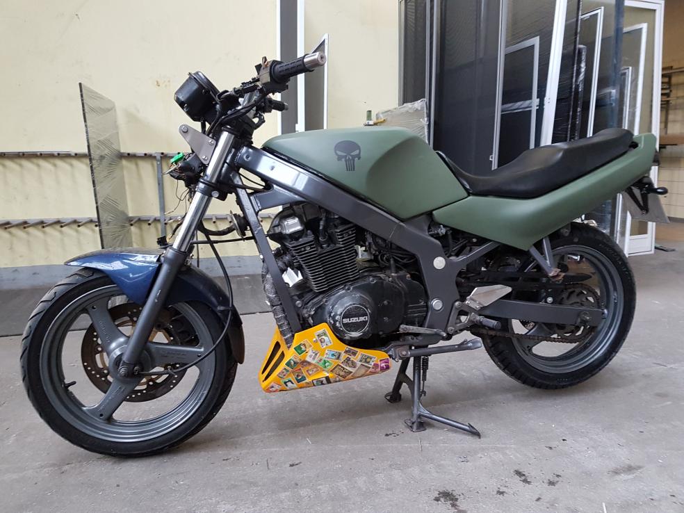 Was hat sich also in den letzten Monaten getan? Natürlich habe ich den hier bemängelten Bugspoiler tiefer gesetzt. Direkt danach gab es einen neuen Bremssattel vorne und andere Spiegel. Es gab Edelstahlschrauben für den Motor, eine neue Kupplung, einen neuen Kettensatz, die Schwingenlager wurden gereinigt und gefettet, den Umlenkhebel gab es von einer Bandit. Eine (bisher unlackierte) Sitzbankabdeckung gab es ebenfalls. Der Endschalldämpfer wurde um 10cm gekürzt, ein offener K&N Filter verbaut und das ganze mit einem Dynojet Stage 3 Kit abgestimmt. Klingt jetzt wie eine große. Die Kiste läuft deutlich besser als original, springt besser an und zieht aus dem Drehzahlkeller deutlich stärker durch. Alles natürlich im Verhältnis. Ich überlege noch, ob sich ein neuer Krümmer bzw. eine komplett andere Auspuffanlage lohnen würde, denn eigentlich möchte ich mir nächstes Jahr was größeres zulegen. Mal sehen.