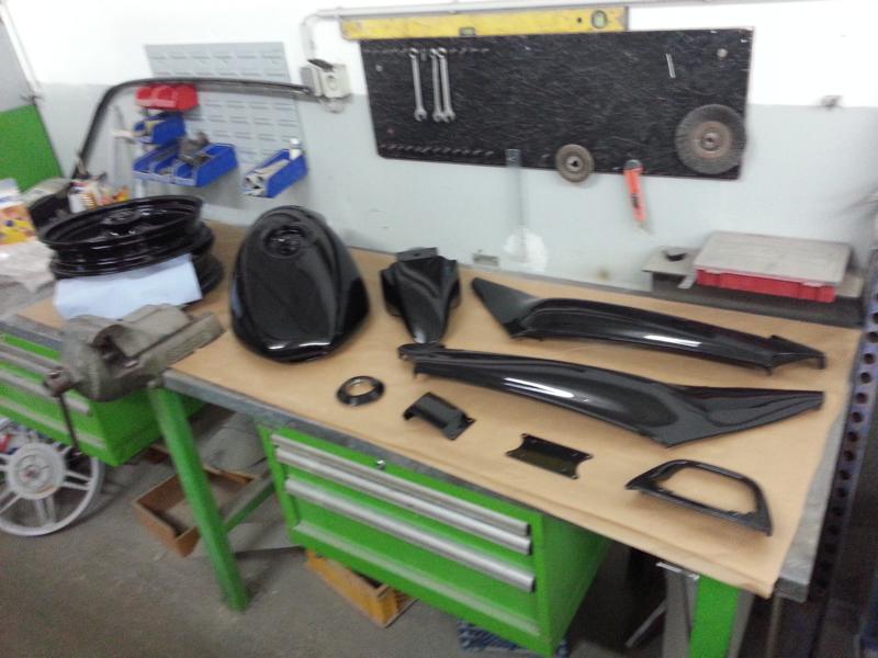 Nun ich steh nicht so auf Silber, und die Verkleidung sowie die Felgen sind schon lackiert worden zumindest in Basis schwarz. Jetzt fehlt nur noch der Effektlack auf Tank und Seitenverkleidung, sowie der Klarlack. Mfg V3ltins |