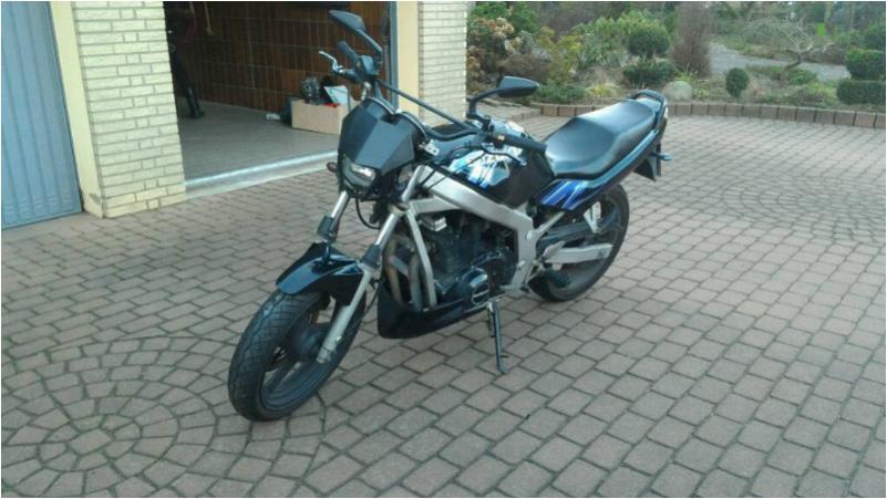 Dann hier mal noch eben als Lückenfüller: 93er Baujahr, etwas über 50,000km auf der Uhr. Cross-Lenker, Sumo-Maske, Bugspoiler, Brülltüte, LED-Rücklicht, Miniblinker, CNC-Hebel, Kampfspuren. Hat sogar TÜV.