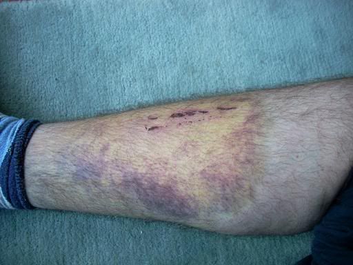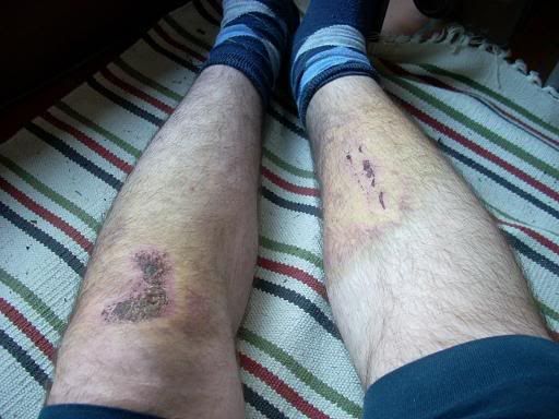 Ein Glück, dass dir nicht allzuviel passiert zu sein scheint. Ich bin auch durch meine eigene Schuld gestürzt, so ein kleiner Warnschuss vor den Bug ist vielleicht manchmal gar nicht so schlecht, man wird sonst schnell allzu übermütig. Zum Trost hier ein paar Bilder von meinen Beinen 5 tage nach dem Unfall. Die Schürfwunden waren ein Witz im Vergleich zu den Schmerzen von meinen gequetschten Fuß...