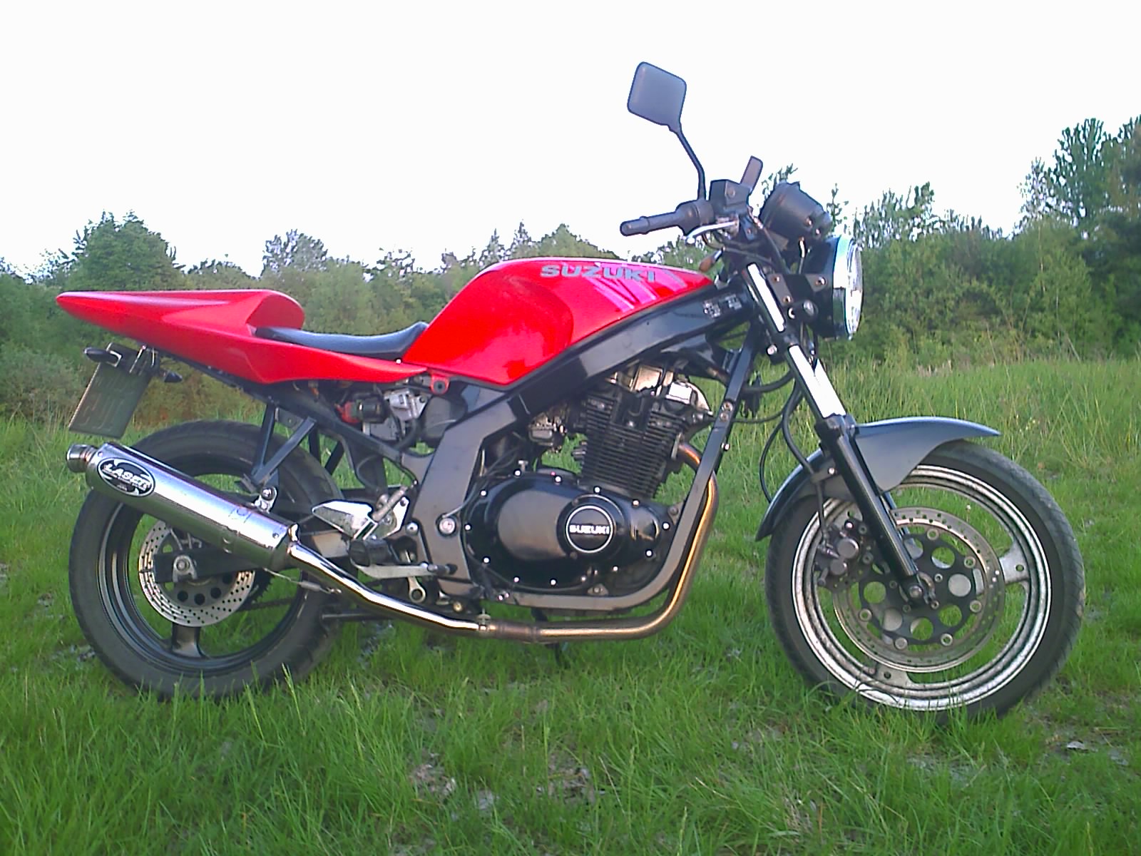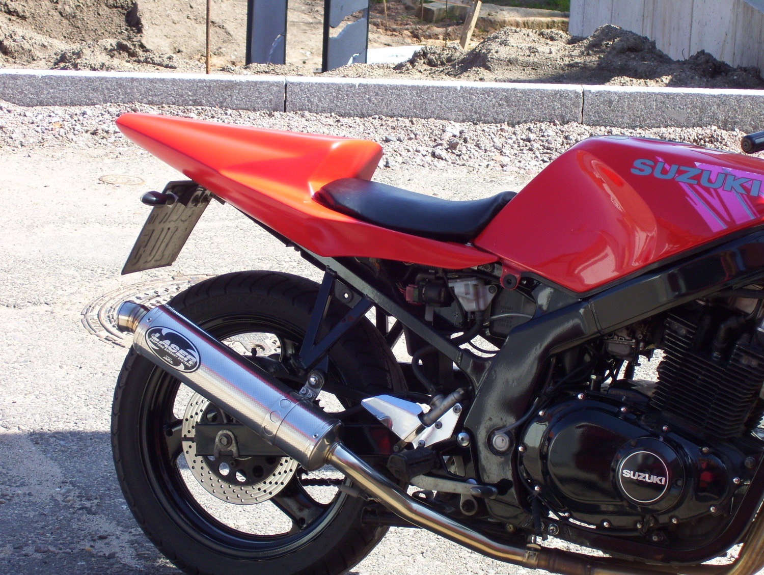 da ich neu bin wollte ich mich und meine gs hier mal kurz vorstellen. Habe sie mir zu meinem 18ten gekauft und fahre sie jetzt seit ca 3 jahren. das forum entdeckte ich letztes jahr im winter und bin dann direkt auf die umbaukategorie gestoßen (sehr geniale sache)... kurz vor ende der sesson wurde mir die vorfahrt von einem autofahrer genommen.. irgendwie war die gs dem auto ein „bisschen“ unterlegen. Bei ihm nur ein paar dellen bei mir ein wirtschaftlicher totalschaden. Meinte zumindest die versicherung...für das geld habe ich sie dann umgebaut und wieder hergerichtet also hier meine umbaustorie: im winter wurde der motor ausgebaut und die 2 brocken unters dach getragen anschließend habe ich sie komplett zerlegt, gereinigt, geschmiert und umgebaut ... was geändert wurde bis jetzt war: rahmenfarbe in schwarz hochglanz (pulverbeschichtet) hinterradschwinge in schwarz hochglanz (pulverbeschichtet) farbe für die federgabeln in schwarz hochglanz (2k eigenlackiereung sämtliche cockpitteile in schwarz hochglanz (2k) neue heck aus gfk einer yamaha r1 (eingetragen) soziussitzaufhängung (selbstgebaut, hat mir der tüv zu meiner eigenden verwunderung eingetragen) 2 neue sitze (vordersitz ist aus dem alten sitzt entstanden) aufhängungsteile für den fahrersitz (alles selbstgebastelt bremsscheibe vorne sportauspuff (laser deeptone) led rücklicht kettenschutz numernschildbefestigung und beleuchtung lenkkopflager schwingenlager vorderradfelge in schwarz hochglanz (bilder hierzu kommen noch, hab gerade keinen foto) hinterradfelge in schwarz hochglanz kleinteile wie scheinwerfer in schwarz hochglanz was noch kommen soll: tank und heck bekommen eine neue farbe bin mir aber noch nicht sicher welche, irgendwas zwischen neon grün,schwarz, wieder rot oder jägermeisterorange, wenn jemand ne idee hat immer her damit ... evtl. vollverkleidung... sou und hier mal ein paar bilder ... sind leider nicht mehr ganz aktuell ... werd aber bald noch ein paar hochladen mit lackierter vorderradfelge und kettenschutz gruß jan |