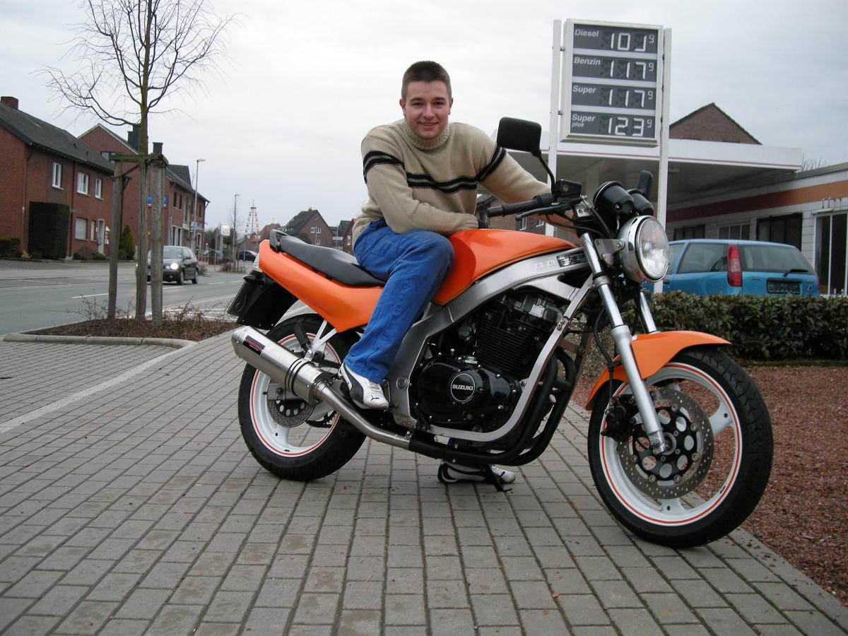 ich möchte Euch mal meine GS vorstellen. Ich habe Sie Anfang 2008 gekauft und seitdem nach und nach ein wenig meinem Geschmack angepasst. Sie ist Bj. 93, offene 46 PS, hat einen Km-Stand von ca. 32.000 und ist top gepflegt Veränderungen: -LED-Tachobeleuchtung in blau (demnächst orange) -LED-Blinker vorn und hinten von Shin-Yo inkl. lastunabhängiges Relais -Bugspoiler von MBD -Brems- und Kupplungshebel in Carbonoptik -Abblendlichtbirne MTEC Superwhite -MD-Öltemperaturanzeige -Felgenrandaufkleber in orange -Neulack in Electric-Orange-Met. vom Ford Focus ST -Takkoni Auspuff Als ich sie gekauft habe, sah sie noch so aus: [attachment=8:gxtxq4bi]S6300936.JPG[/attachment:gxtxq4bi] [attachment=7:gxtxq4bi]S6300946.JPG[/attachment:gxtxq4bi] Mir war sofort klar, dass meine GS 500 nicht so bleiben konnte. Also beschloss ich direkt ein paar Verschönerungen durchzuführen Als erstes sofort den Spritzschutz hinten und die Scheibe vorn abmontiert und ein paar Aufkleber entfernt! Daraufhin sah sie so aus: [attachment=6:gxtxq4bi]Bild205.jpg[/attachment:gxtxq4bi] [attachment=5:gxtxq4bi]Bild220.jpg[/attachment:gxtxq4bi] Schon ein wenig besser Mich störten noch die Blinker und das Rücklicht, also alles in LED-Technik! [attachment=4:gxtxq4bi]S6301325.JPG[/attachment:gxtxq4bi] Sooo... und da mir dieses LILA auf den Sack ging, habe ich die ganze Karre in Electric-Orange-Metallic lackiert! Zwar selbst mit der Hilfe eines Kollegen mit der Sprühdose aber dieses Jahr wirds nochmal fachmännisch vom Lackierer gemacht! Bugspoiler ist auch noch dazugekommen. [attachment=3:gxtxq4bi]S6302953.JPG[/attachment:gxtxq4bi] Felgenrandstreifen in orange sind auch hinzugekommen (war das ne Arbeit [attachment=2:gxtxq4bi]S6302950.JPG[/attachment:gxtxq4bi] Aber ich finde es hat sich gelohnt [attachment=1:gxtxq4bi]S6302952.JPG[/attachment:gxtxq4bi] Nun macht Sie einen Winterschlaf und wurde schön von mir geputzt und konserviert: [attachment=0:gxtxq4bi]S6303432.JPG[/attachment:gxtxq4bi] Dieses Jahr folgt: -Fachmännische Lackierung (ist grad in Arbeit) Das wars eigentlich vorerst von mir... Würde mich über ein paar Meinungen freuen! |