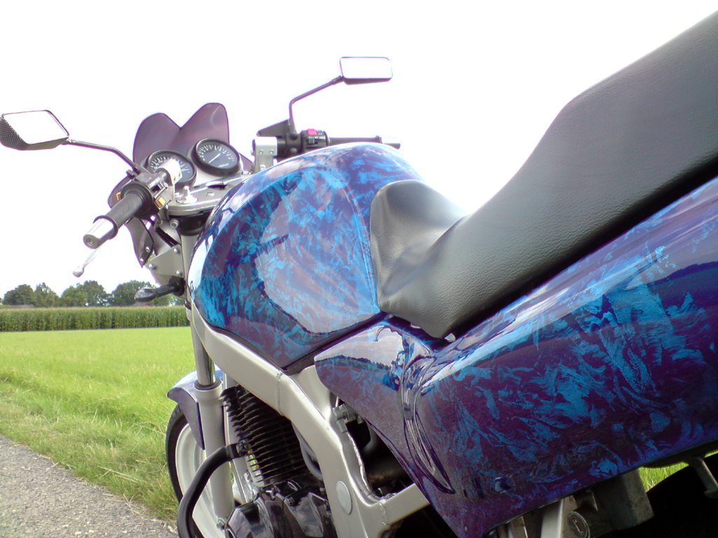 Suzuki GS 500 Erstzulassung 1994, 33.898 Kilometer Umbauten / Änderungen: - Lack mit Effekt bei Sonne - Super-Bike-Lenker - LED-Rückleuchte und -Blinker - gekürztes Front-Schutzblech - Airbrush-Tachoscheiben - Sitzbank stufig aufgepolstert - Stahlflex vorne - Carbonspiegel - gekürzte Seitenverkleidung