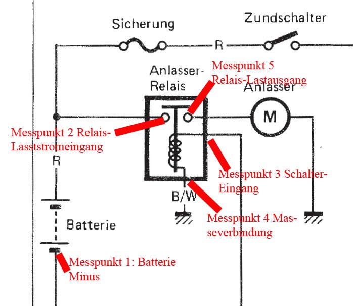 also ich habe dir per PN schon einen kompletten Schaltplan zukommen lassen. Aus deinen vorherigen Antworten habe ich rausgelesen, dass du ein Multimeter (Spannungsmesser) zur Hand hast und damit messen kannst. Damit deine Messungen strukturiert werden und alle wissen worum es geht habe ich mal in einer Skizze ein paar Punkte markiert. Ich würde wie folgt vorgehen: Bei allen Messungen Multimeter auf Spannungsmessung und Minuspol des Messgerätes auf Batterie Minus Messpunkt 1 oder ein gut an Masse angebundenes Metallteil. Leider habe ich im Moment nicht die Möglichkeit zu überprüfen, welche Messpunkte wirklich zugänglich sind, da ich nicht in der Nähe meiner GS bin!!! Messung 1: Potential an Messpunkt 2 messen während Startschalter ungedrückt: Mindestens 12 Volt müssen anliegen. Messung 1.1: Während Schalter gedrückt ist: Ist der Wert der selbe wie vorher oder sinkt die Spannung? Messung 2: Potential an Messpunkt 5 messen während Startknopf gedrückt ist: Nahe 12V: Relais ist ok, Fehler liegt nach dem Relais. Weit niedrigere Spannung als in Messung 1.1 gemessen: Relais hat nicht geschalten/hat eine Unterbrechung. Messung 3: Potential an Messpunkt 4 Messen während Startknopf gedrückt: Nahe 0 Volt: kein Masseproblem der Relaisspule Merklich > 0V: Masseanschluss überprüfen Messung 4: Stecker an Messpunkt 3 abziehen! Potential am abgezogenen Kabel messen: Nahe 12V: Schalter scheint ok zu sein Nahe 0V: Kabelbruch zwischen Schalter und Relais oder Schalter defekt. Messung 5: Stecker wieder anstecken. Messung wenn möglich an Messpunkt 3 wiederholen. Wenn Messung 4 ->12V und nun nahe 0V: Widerstand im Schalter/Zuleitung zu hoch. Sollte die bei den Messungen etwas auffallen, dann einfach mal die Einzelergebnisse posten! Lg kletty |
