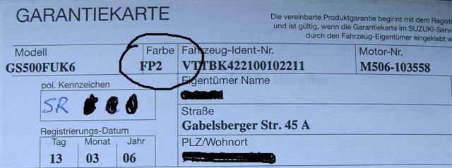 Sonst kann dir der Händler nach der Fahrgestellnummer den richtigen Code sagen. Es gibt den Lack übrigends auch original von Suzuki (in homöopatischen Dosen von 1/8l) und das zu - ich nenns mal gewagten - Preisen - das nur so zur Info....
