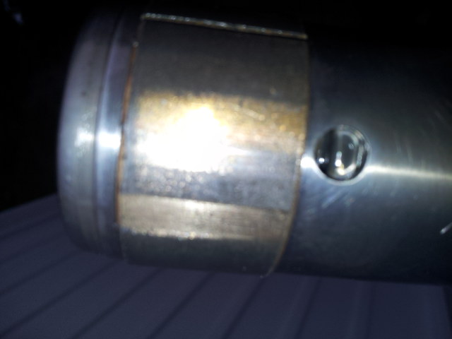 So sieht die andere Antifriktionsmetall innen auch aus. Da sind die ja nicht beschichtet, weil sie fix auf dem Standrohr bzw. im Tauchrohr sitzen (der eine außen, der andere innen). Beim dünneren Ring sieht man aber auch deutlich die Scharte. Würde ich auch neu machen. Neu sind die grau beschichtet (irgendwas gleitfreudiges, im Werkstatthandbuch wird es TEFLON genannt). Darunter ist eine Kupferschicht. Normalen Verschleiß erkennt man also daran, dass das Grau dem Kupfer weicht (ich glaub ich hab irgendwo mal gelesen, dass die Buchsen getauscht werden müssen, wenn die Hälfte der Fläche ohne Beschichtung ist).