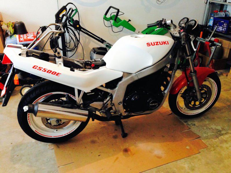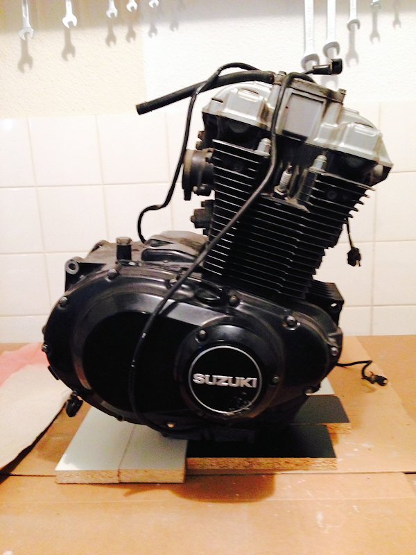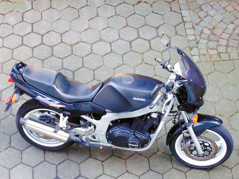 Im Sommer letzten Jahres haben wir uns ein neues altes Zweitmopped zugelegt. Nun, mit uns meine ich eigentlich das ich losgezogen bin und für meine Frau ein Motorrad für den Wiedereinstieg gekauft habe, da sie aufgrund des Nachwuchses ein paar Jahre nicht mehr gefahren ist. Die Anforderungen welche ich an ein Wiedereinsteigerbike stelle (gestellt habe) sind eine leichte Handhabung (die Silhouette darf also nicht zu wuchtig ausfallen), sowie eine sanfte Leistungsentfaltung. Zudem ist eine leicht zu wartende Technik ebenfalls von Vorteil. Zu guter Letzt, da es ein „Übungsmotorrad“ ist, sollte es günstig in der Anschaffung sein. Ein Kratzer darf also nicht so wehtun. Betrachtet man unter diesen Aspekten den aktuellen Markt, gibt es nicht allzu viele Modelle, welche in Frage kamen. Meine Entscheidung viel recht schnell auf eine GS 500 mit knappen 20.000 Km auf der Uhr. Was man beim Kauf unbedingt beachten und wissen muss, es gibt kein ultimatives Schnäppchen. Entweder ist der Preis gut aufgerufen, dann ist die Qualität auch gut oder es gibt was recht Preiswertes, dafür aber dann entsprechend mit reichlich Abstrichen in der Optik und Pflege. Mein Kauf war sehr günstig, technisch einwandfrei, dafür aber optisch – wie soll ich es sagen – kein Hingucker auf dem Moppedtreff. Durch einen leuchten Rutscher auf der Seite war hier ne kleine Schramme und dort nen kleiner Kratzer. Das Ganze recht lieblos aus der Dose mal fix drüber gesprüht. Alles kein Problem, denn als Übungsbike kann ja noch nen weiterer Kratzer hinzukommen. So der Grundgedanke. Also ab in den Anhänger und nach Hause. Frau überraschen. Habe Mopped gegen nen kaltes Weizenbier getauscht. Nun kann man(n) behaupten das wäre ein schlechter Tausch gewesen. Nach vier Stunden Autofahrt bei gefühlten 38° war es das nicht. Gute Entscheidung. Abgesehen davon hat Frau sich gefreut wie Bolle. OK, Mopped stand in der heimischen Werkstatt. Die Technik noch mal in Ruhe überprüft, das was nötig war gewartet und ab damit auf den Übungsplatz. Die ersten Übungsrunden im Spätsommer 2014 sind super verlaufen. Hat alles toll geklappt. Dann kam der Herbst, schlechtes Wetter. Saison vorbei. Dann kam der Winter. Was machen?!? Mopped fahren is nicht …. Aber Mopped schrauben! Also ran an die Buletten und das „Übungsbike“ aufhübschen. Muss ja zur Frau passen ^^ Die Ausgangsbasis: GS 500 E in schwarz mit Dragonfly Maske, Tank aus der Dose lieblos nachgesprüht und auch ansonsten bei näherer Betrachtung nicht wie ein Juwel gepflegt. Aber die Technik ist in Ordnung: |