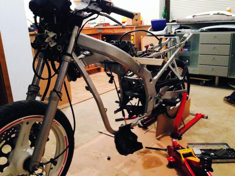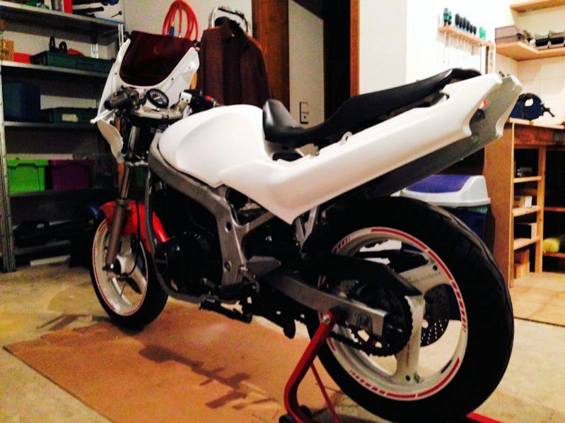 Wie soll das Bike nach der Aufhübschung aussehen? Thema Nummer eins: die Farbwahl. Das schwarze übernehmen? Nur in schön? – wäre am einfachsten. Möchte aber was anderes. Rot? Find ich eine gute Frauenfarbe. Aber nein. Rot ist nur ne Duc oder nen Ferrari. OK, Feuerwehrautos auch. Das war es dann aber auch schon. .. aber rote Akzente wären schick. Hmmm. Welche Grundfarbe passt denn dazu am besten? Klar, weiß. Macht aber aufgrund der schwarzen Basis auch die meiste Arbeit. Naja, ist ja für die Frau und es ist Winter. Also los. Wunschvorstellung: Weißes Bike mit roten Akzenten, aber nicht zu aufdringlich. Dazu einen schönen schwarzen Rahmen (der originale hat ebenfalls reichlich schwarzen Sprühnebel abbekommen). Das dies in einem Winter nicht alles zu schaffen ist, ist klar. Also machen wir diesen Winter (2014/2015) Blech und nächsten Winter (2015/2016) den Rahmen. Guter Plan! Chapter III - Los geht’s: Erst einmal alles entstrippen. Tank, Heckverkleidung, Soziusgriff, und Lampenmaske müssen runter. Das soll ja alles neu lackiert werden. Also auf geht’s: |