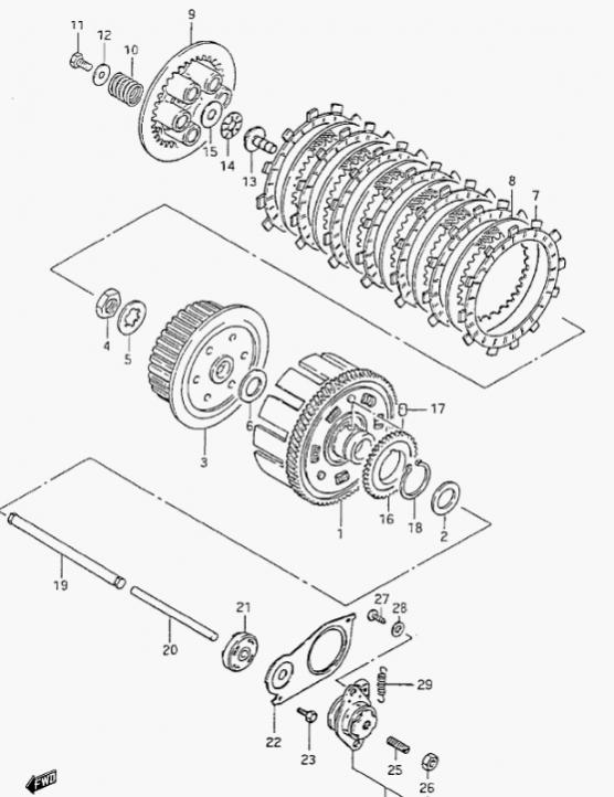 Leider habe ich seit einer Woche ein paar Probleme mit der Kupplung meiner GS. Weder Kupplungsdruckstab (Teil 20) noch der Korb bewegen sich (hab dort beim Ölmessstab hinein geguckt)