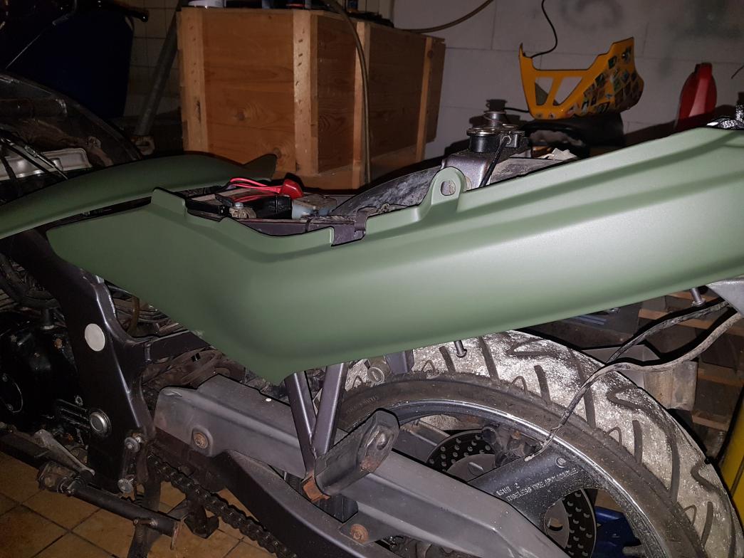 Eine neue Heckverkleidung wurde besorgt, die alte war gebrochen. Gleichzeitig habe ich mich nach langer Suche für eine Farbe entschieden. Bronzegrün-Matt! Die Heckverkleidung wurde probehalber lackiert und es gefällt mir gut. Auf kurz oder lang muss aber der Rahmen schwarz.