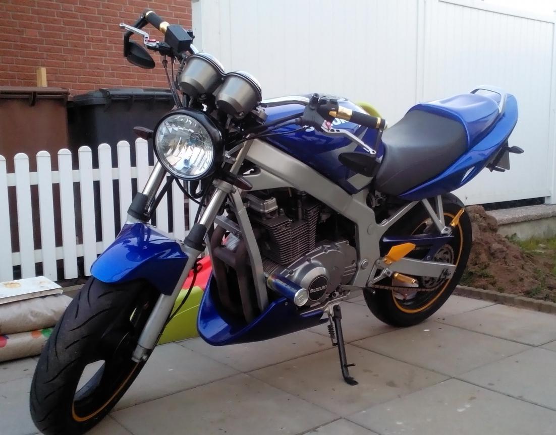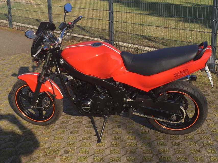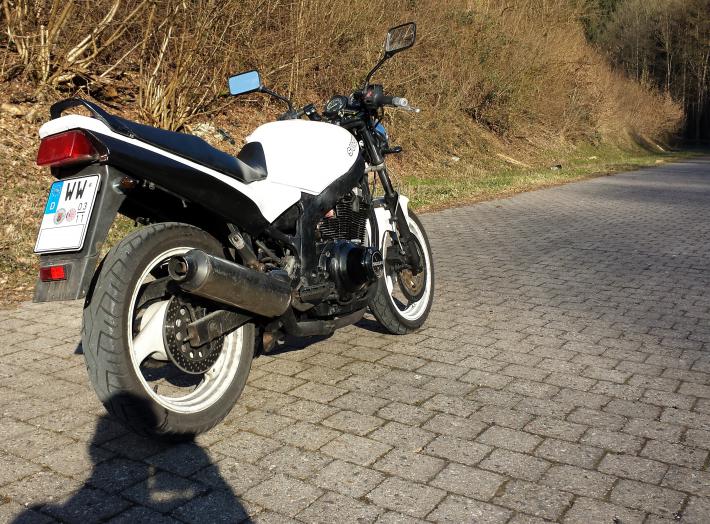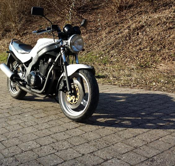 hier die Daten meines Winterprojektes: GM51B, BJ 94, 50.000 km. Änderungen: Rahmen, Schwinge, Anbauteile, gestrahlt und schwarz gepulvert Felgen schwarz lackiert Orange lackiert mit weiss/braunem Längs-Streifen versehen (Farben Cleveland Browns Football Helm, die einzig wahren Farben) Scheibe Spiegel LED-Rücklicht Felgenbänder Laser Deeptone schwere Lenkerenden Miniblinker Nummernschildhalter modifiziert Radverkleidung 20 Liter F-Tank und spezielle Halter verbaut Superbikelenker Stahlflex Scottoiler Steckdose Ölthermometer aufgepolsterte Sitzbank für die langen Touren Motor Kopf- und Fussdichtung gewechselt, Ventile eingestellt Kettensatz neu Vergaser gereinigt und synchronisiert alle Bowdenzüge erneuert Promoto Federn, Wilbers Federbein Staubschutzkappen am Tauchrohr Nun warte ich noch auf den ollen Kupplungsbowdenzug, damit ich wieder startklar bin, mann will ich fahren... ![]() ![]() ![]() ![]()