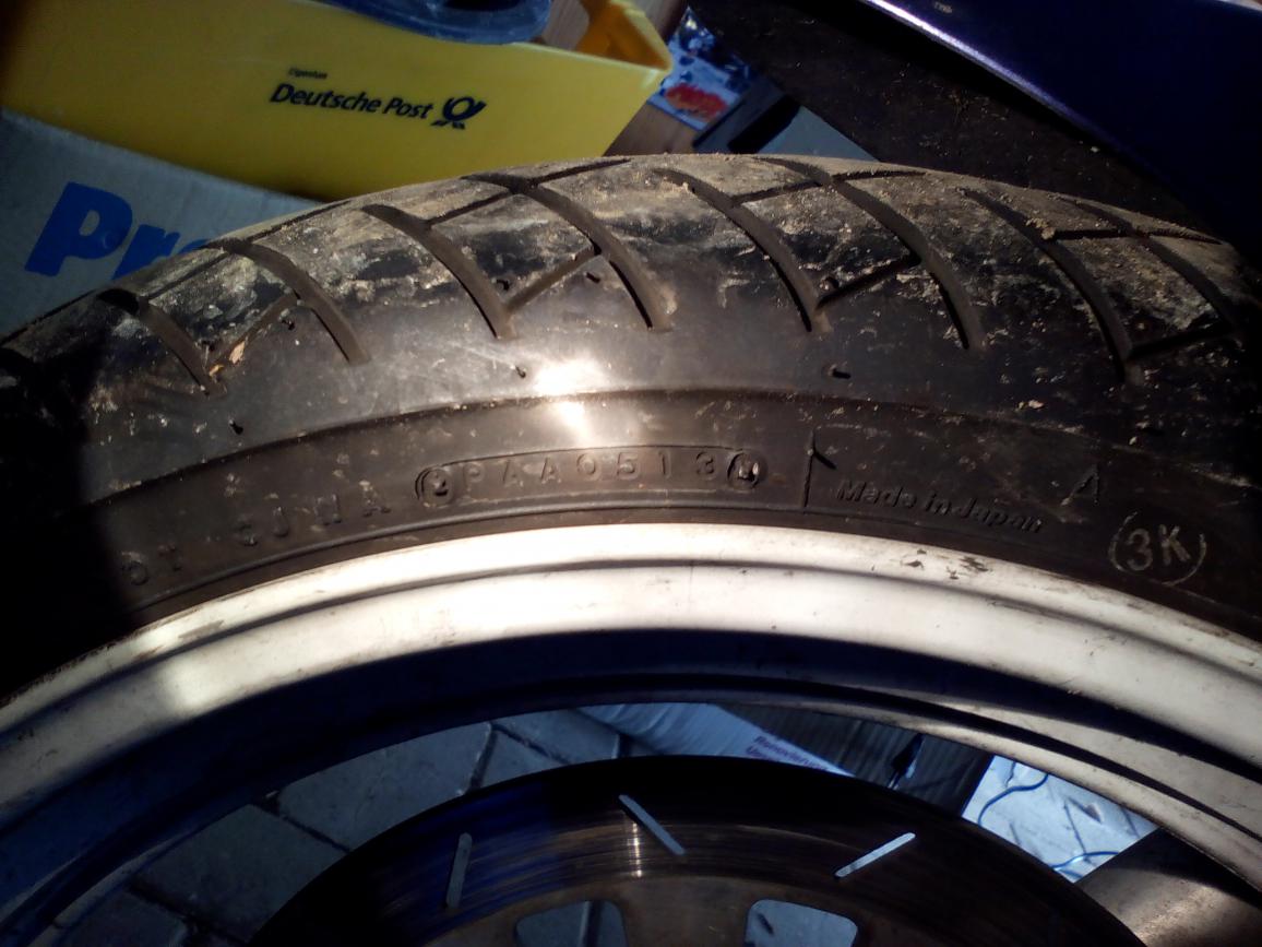 Das mit der DOT auf dem Reifen ist ja schön einfach. Wenn man sie findet... Ist das die DOT? Hinten 0415, Reifen also aus Kalenderwoche 4 2015, hat noch 5mm. Vorn 0513, Reifen also aus 5. Kalenderwoche 2015, hat noch 3mm. Ja, ich weiß, das ist vermutlich eine dumme Frage.