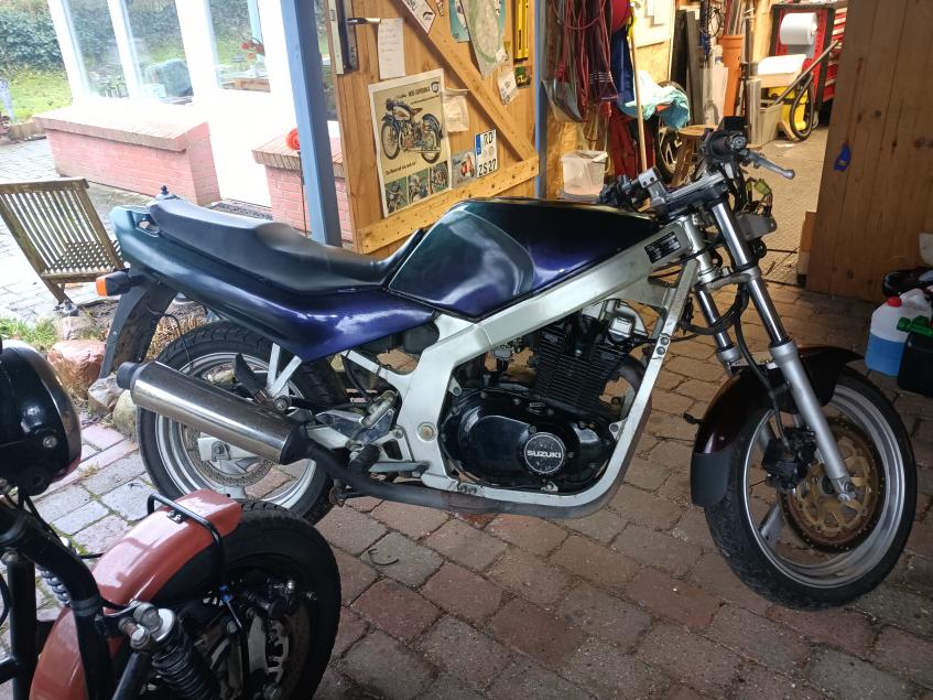 Vor vielen Jahren bin ich mit meiner 400 Bandit über den Spreewaldring gedüst oder habe auf dem HBR mein Unwesen getrieben. Irgendwie fehlt mir das ein wenig und ich will dieses Jahr mal wieder "einsteigen". Ich bastel mal eine GS zusammen, die auf kleinen Rennstrecken Kurventrainings und Freies Fahren praktizieren soll. Da hier noch dies und das rum liegt, bleibt es spannend wie sie nachher aussieht. Eine B-4 Gabel und Räder habe ich gerade sehr günstig gekauft, da pressen wir demnächst mal die Jochs um und dann sieht das vorne schon mal schick aus. Hinten muss ein Federbein rein, welches auch mit meinem Körpergewicht zurecht kommt Auf Verkleidung werde ich verzichten, Style geht wohl so Richtung Cafe Racer. Lampen und ähnliches Gedöns wird es nicht geben, wird ein reines Just4Fun-Fahrzeug. Wenn es was zu sehen gibt, lasse ich Euch teilhaben. Für Anregungen bin ich immer dankbar. Gruß Volker