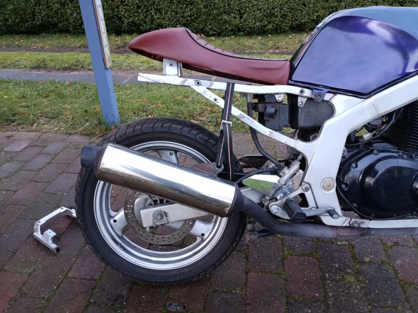 Die ersten 400€ sind für die Maschine drauf gegangen, 100€ für eine Gabel und Räder von der B4 und schon ist der halbe Tausender weg, wo soll das noch hin führen ![]() Nächste Woche machen wir mal das Heck etwas hübsch, da mein Schweisser gerade lange Weile hat. Ich wollte eigentlich nur Fragen, ob das irgendwann mal passt, zack, nächsten Donnerstag wird geflext und geschweißt Soziusfußrasten kommen weg und die Abstützung etwas steiler und kürzer, so als Einsitzer halt. CafeRacer Sitzbank, gebraucht, ebay, 20€ und so suche ich mir mal meinen Kram zusammen. Die GS läuft gut, Reifen und Federbein kosten noch Geld und dann muss wohl ein M-Lenker her, weil leider geil! Rest sollte sich finden, soll diesen Sommer fahren, muss aber nicht fertig werden, eben alles just4fun, nur kein Stress. Joch >Umpressen muss ich mal schauen, wann der Kollege mit der Presse Zeit hat und den Rest sollte ich dann alleine hin bekommen. Für leichte Teile am Moped bin ich zu fett Grüße Volker