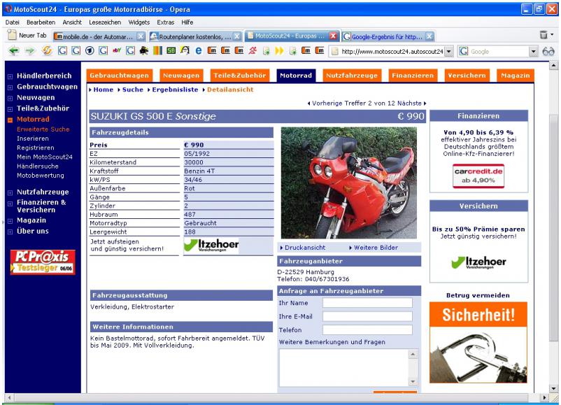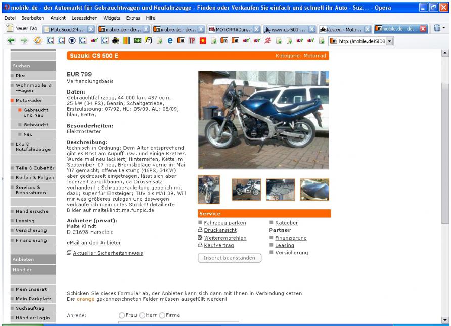 Zufälliger Weise habe ich noch ein paar Screenshots aus dem Herbst 2007 als ich mir eine GS kaufen wollte. Angebote die mir damals (als ich noch wenig Ahnung hatte) günstig erschienen habe ich zu Vergleichszwecken halt gespeichert. Ob die GS nun teurer geworden ist kannst du dir ja selbst überlegen. Die Türkisfarbene habe ich mir angeguckt und wie sich herausstellte waren die Simmerringe undicht. Die für 1000 Euro habe ich dann für 900,- gekauft. Ich wollte unbedingt eine mit geringer Kilometerleistung haben...