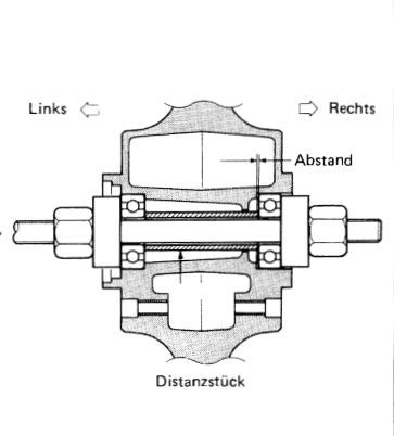 Hier ein Bild mit Montagewerkzeug wie das Distanzrohr (schraffiert) zwischen den Lagern sitzt. Die Lagerinnenringe sitzen auf dem Distanzrohr, das verhindern soll, dass Seitendruck auf die Lager kommt. Laut Beschreibung sollte das linke Lager (in Fahrtrichtung) zuerst montiert werden.