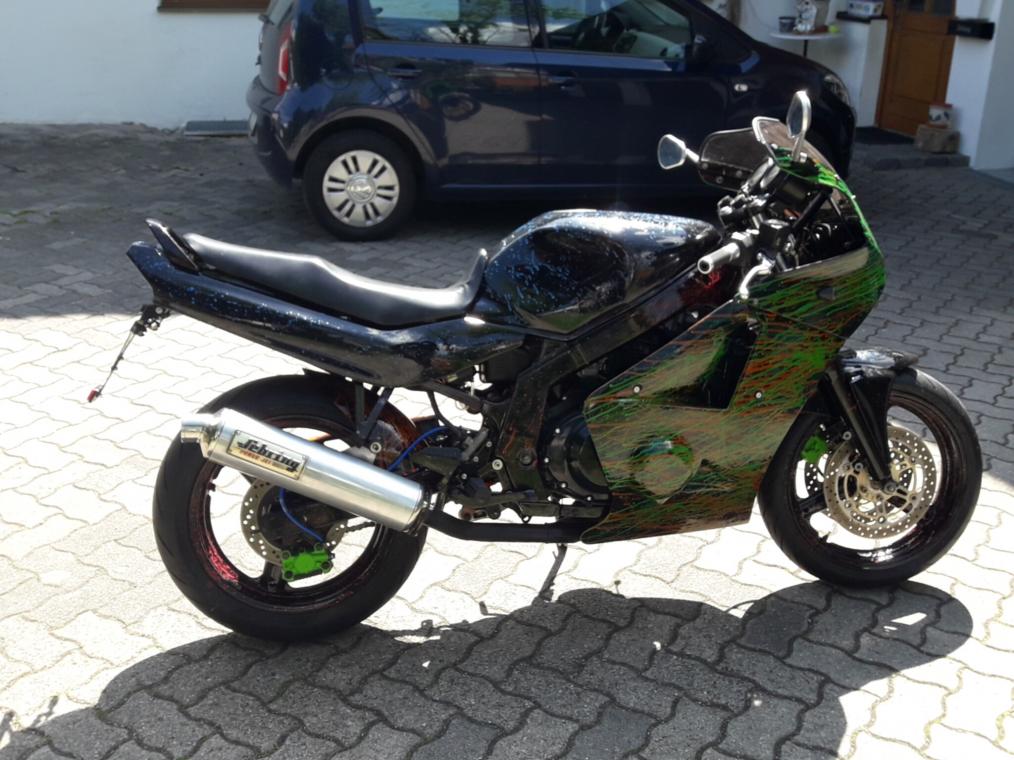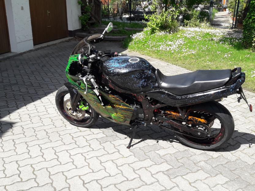_____ Ich hatte nach einem Unfall 2015 schon zu lange kein fahrbares Motorrad mehr, dafür die Überbleibsel meiner alten GS und das lange Ewigkeitsprojekt, das mir regelmäßig durch seine bloße unfertige Existenz die Laune verdarb und meinem Vater im Weg rumstand. Letztes Jahr hat mich der Rappel gepackt und ich sammelte die besten angesammelten Teile zusammen, die mit annehmbarem Aufwand ein fahrbares Ganzes ergeben könnten. Zwei Urlaubswochen und viele Flüche später stand das, was ihr auf den Bildern seht, herum. Die Gabel sifft und der Lenker nervt, der Tüver stellte viele Aufgaben, zusätzlich ging mal wieder sowohl Zeit als auch Geld aus., eh klar ![]() Also habe ich am Freitag hier gepostet, um wieder Motivation zu bekommen, das Ding fertig zu bekommen. Es hat funktioniert, danke euch allen! ![]() ______ Hier ist die technische Seite: Hinterrad: SV650, je nach Tüver-Laune mit den Aluscheiben Bremsanker: RF600, abgefräst Schwinge: GS500 mit zwei angeschweißten Stahlklötzen für den Bremsanker Federbein: BMW S1000RR Vorderrad, und Gabelstabilisator: GSX600F AJ Gabel und Bremse: GSX600F GN72 Bremspumpe: Hoffentlich FZ6 RJ07 (16mm), zur Not GN72 (14mm) Gabelbrücke oben: VX800 Lenker: LSL Klemmböcke (noch mit geteiltem Superbikelenker) Fender: Irgend ein Prototyp, der nie in Serie ging Verkleidung: Gimbel RGV, zur einfacheren Wartung dreiteilig gemacht Heckunterverkleidung: Balu-Racing. Der Shop war letztes Jahr kaputt, aber Lutz hatte noch Sachen auf Lager. Das Sitzbankschloss habe ich an der Original-Halterung, wobei der Rest der Gepäckstrebe der Flex zum Opfer fiel. Für den Schlüssel ist ein Loch im Seitenteil. Radverkleidung: Balu-Racing, den Höcker für die Bremsankerstrebe habe ich weggemacht und die Verlängerung für die lange Schwinge wieder abgesägt. Tank: GS500F Sitzbank: GM51B, auf den Fotos ist der vordere Spitz noch nicht abgesägt. Wenn ihr Tipps zum Aufpolstern habt, immer her damit Rücklicht: In den Blinkern _____ Die Lacksachen haben am meisten Zeit gebraucht, ein bisschen weil die Verkleidung in einen Unfall verwickelt war, aber vor Allem weil ich beim ersten Mal Spritzspachtel-Auftragen nirgendwo lesen konnte, dass das Zeug Härter braucht. Es wurde auch keiner mitgeliefert. Ich naives, naives Ding. ![]() Vielen Dank an an dieser Stelle an meinen Bruder, der lieberweise richtig viel geschliffen und gespachtelt hat ![]() Die Devise bei der Farbgebung war, Lacknasen mit noch viel mehr Nasen zu verdecken, denn ich bin zu ungeduldig für sowas ![]() Die Basis ist Schwarz, darauf habe ich Neon-Pigmente in Klarlack gelöst von einem Pinsel geschleudert. Leider war ich mit Blau und Pink zu sparsam für meinen Geschmack. Darüber kam dann noch Klarlack, außer bei der Verkleidung. Bei der Verkleidung habe ich einfach direkt aus dem Farbbecher geschüttet, nachdem ich den Lack schon leicht anziehen ließ. Geändert von irgendwer92 (08.03.2020 um 21:23:09 Uhr) |