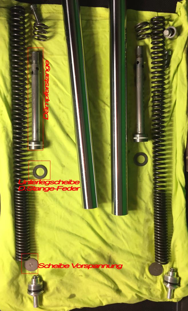 Teil 1: R6 Federbein Benötigte Teile: -Federbein R6 -Umlenkstreben 170mm -Umlenkung Suzuki Bandit -2 Buchsen Wie schon in einigen Thread besprochen ist das Yamaha YZF-R6 RJ11/15 Federbein eine passende Alternative zum Original oder dem Wilbers-Federbein. Alles was dazu zu tun ist, ist das Original Bein gegen das fast gleich große R6 RJ 15 Bein (Teilenummer: 13S-222 10-00) zu wechseln. Zusätzlich werden Umlenkung und Streben getauscht. Das RJ11 Federbein scheint sich etwas vom RJ15 zu unterscheiden, da ein Bekannter nach dem Wechsel ein deutlich höheres Heck mit Original Streben hatte. Hier sind vermutlich keine anderen Streben notwendig. Einfach vorher und nachher am Heck messen. Edit: Außerdem muss der Luftfilterkasten beim RJ11 Federbein etwas höher gelegt werden, da er ansonsten an das Federbein anstößt. RJ 15 passt hier problemlos. In meinem Fall habe ich das RJ 15 Federbein mit 170mm Streben verbaut, um die original Höhe des Hecks wiederherzustellen, da sie nach dem Wechsel etwas kleiner als im Originalzustand ist. Desweiteren habe ich die Umlenkung einer Suzuki Bandit benutzt, da das Federbein ansonsten an der Schwinge anschlagen kann. Mein Teil hat die Kennzeichnung 32F und wurde in der Bandit 650 ab 05, sowie der 1200/1250er von 01 bis 12 verbaut. An sich sollten sich die Teile der Bandit jedoch nicht unterscheiden (soweit mir bekannt). Erforderliche Kenntnisse: Federbein ausbauen Wichtig ist noch, das das untere Auge etwas größer ist als das Original (glaube 1mm). Hier einfach messen und sich z.B. in der Bucht Hülsen zum Ausbuchsen bestellen. Die gibt es mit Schlitz zum einfachen Einpassen. Musste meine nur auf Länge schneiden. Erfahrung: Federbein lässt sich super Fahren. Meiner Ansicht nach, noch besser als das Wilbers. Die Einsteller bieten zusätzlich weitere Anpassungsmöglichkeiten, jedoch sollte man bei Serienbeinen nicht zu viel erwarten. Für Leute die es sich zutrauen: Das Bein ist zerlegbar, wenn auch nicht so einfach. Falls man Infos zu Füllmengen, Öltyp und Ausgleichsbehälterdruck hat und ein bisschen basteln will, kann man ja mal versuchen die Shimstacks anzupassen. Yamaha rückt auf jeden Fall nichts raus. Abnahme: Für den Umbau wird eine Einzelabnahme benötigt, was sich von Prüfer zu Prüfer bzw. Bundesland zu Bundesland schwer oder einfach gestalten kann. Als Unterlagen kann man sich von Suzuki die Zugehörigkeit des Umlenkungsteils zur Bandit bestätigen lassen. Nach ein wenig E-Mail PingPong hat sich herausgestellt, dass sich das R6 Federbein nicht eindeutig als solches zuordnen lässt. Die Nummern auf dem Ausgleichsbehälter sagt laut Yamaha nichts darüber aus. Ich habe das Federbein testgefahren und werde dieses Jahr einen Versuch einer Einzelabnahme in Thüringen (angemeldet in Hessen) starten. Bericht folgt. Teil 2: Race Tech Cartridge Emulatoren Benötigte Teile: -Cartridge Emulatoren (https://www.youtube.com/watch?v=j3QYZEQoN_M ) -Gabelöl SAE 15 -ggf. Distanzierscheiben (DIN 988 ) -Race Tech ,möchte gerne, dass man ihre Federn kauft, jedoch fahre ich die progressiven Wilbers Federn, da diese die richtige Federrate für mich besitzen. In einigen Foren aus den Staaten habe ich nur Gutes über die Teile gehört. Kurz gesagt sind es 2 Einsätze, welche die „Damping-Rod-Forks“, welche auch in der GS verbaut sind, in eine Art Cartridge Gabel verwandeln sollen. Dazu werden die normalen Löcher in den Dämpferstangen aufgebohrt, welche normalerweise die Dämpfung kontrollieren. Diese haben dann nur noch wenig Einfluss und das Öl kann recht leicht hindurch fließen. Am oberen Ende der Dämpferstange wird nun zwischen Stange und Feder der Emulator platziert, welcher die Druckstufendämpfung kontrolliert. Im Lowspeed fließt das Öl durch die Bohrungen. Im Highspeed geht, ähnlich wie bei dem Shimstack in der Cartridge, eine Öffnung auf. Diese wird mittels einer Feder und deren Federrate und Vorspannung eingestellt. Die Zugstufe wird über das Öl angepasst. In der Ausfederflussrichtung öffnet der Emulator ein Check-Valve. Wird eigentlich alles im Video erklärt und die Anleitung zum Einbau ist bei dem Artikel dabei. Dennoch ein paar Infos. Funktionsschema: http://www.racetech.com/page/title/E...%20They%20Work Import: Habe die Teile in der Bucht aus den USA bestellt. Haben mit Versand ca. 125€ gekostet. Zahlung per PayPal. Mit Zollabwicklung (nur Steuer-> Zollgebühren ab 150€ Warenwert) war ich dann bei knapp 150€ Einbau: Damit wir wissen von was wir sprechen: Zuerst baut man die Gabel aus und zerlegt sie in Ihre Einzelteile, wie z.B. bei einem Simmeringwechsel. Tipps zum Aus-/Umbau: Gabel ausbauen: http://www.gs-500.info/index.php?tit...n_%26_ausbauen Gabel zerlegen: http://forum.gs-500.de/showthread.php?t=26828 http://www.gs-500.info/index.php?tit..._selbstgemacht http://forum.gs-500.de/showthread.php?t=20352 Dann habe ich mich daran gemacht die Löcher in den Dämpferstangen auf 8mm aufzubohren und um 2 (auf insgesamt 6) zu erweitern. Steht aber auch alles in der Anleitung der Emulatoren. Jetzt baut man die Gabel wieder zusammen. Dabei lässt man die Unterlegscheibe, welche normale unter der Feder sitzt weg. Die Feder sitzt nun direkt am Emulator. (Ich benutze sie noch, aber dazu gleich mehr). Als Öl nehmen wir SAE15 mit der Standart Wilbers Füllhöhe. Jetzt kommt der Kniff an der ganzen Sache. Der Emulator benötigt zwischen Feder und Dämpferstab 16mm Platz. Somit hat man auch 16mm weniger Raum in der Gabel. Hat man die original Federn vernbaut, kann man einfach den Spacer um 16mm kürzen. Hat man die längeren, progressiven Federn von Wilbers, ist der Platz des Spacers jedoch durch die Feder belegt. In meinem Fall konnte ich durch die Vorspannungseinsteller kein Platz mehr gewinnen, da meine Einstellung bei voll ausgedrehter Schraube war. Ich habe also die Scheibe der Vorspannungseinstellung entfernt (sitzt normal oben auf der Feder). Jetzt rutscht die Feder bis auf die Verschlusskappe durch. Nochmal Danke an Jim für de