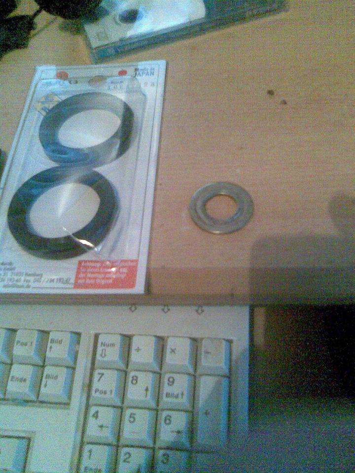 Auf dem boden lag dann diese Scheibe Wo kommt die her? Als Größenvergleich habe ich mal Gabelsimmerringe daneben gelegt. Muss aus der höhe des Federbeins kommen. Evtl ne distanz von der Schwingenachse? Brauch schnell Hilfe! |