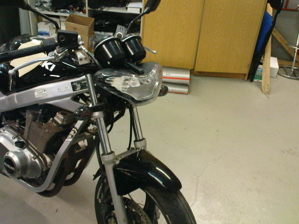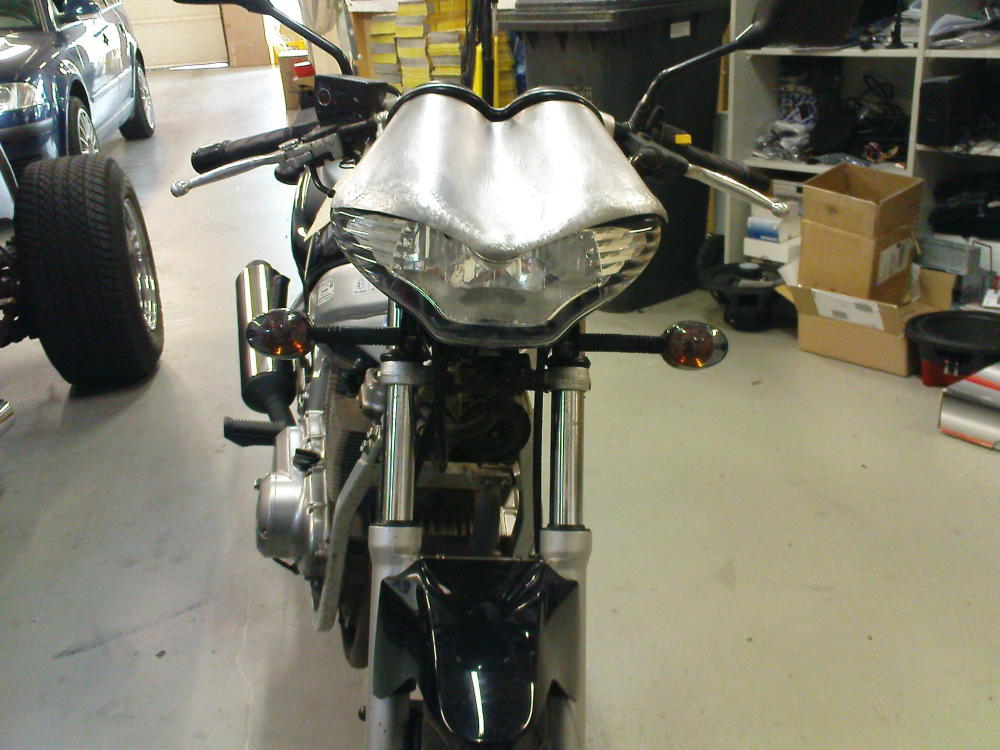Natürlich hat es gleich in den Händen gekribbelt, denn original ist ja öde. Also musste was gemacht werden. Da das Geld wie immer knapp ist, was machen? Also muss mal wieder Ebay her halten. Da wurde bis jetzt gemacht: · Frontscheinwerfer von nem Quad, Halter selbst gebaut und angepasst · Weiße Led Tachobeleuchtung · anderen Vorderreifen · Schloß von der Sitzbank in die Seitenverkleidung versetzt (ähnlich Facelift) · Rücklicht umgebaut, jetzt eins von einer ZX6R · Kennzeichenhalter Eigenbau In Planung: · Maske für Scheinwerfer und Instrumente Eigenbau (schon fast fertig) · Heckhöherlegung · Hinterradabdeckung Ich versuch mal ein paar Bilder hochzuladen, hab nämlich nur Modem. MFG